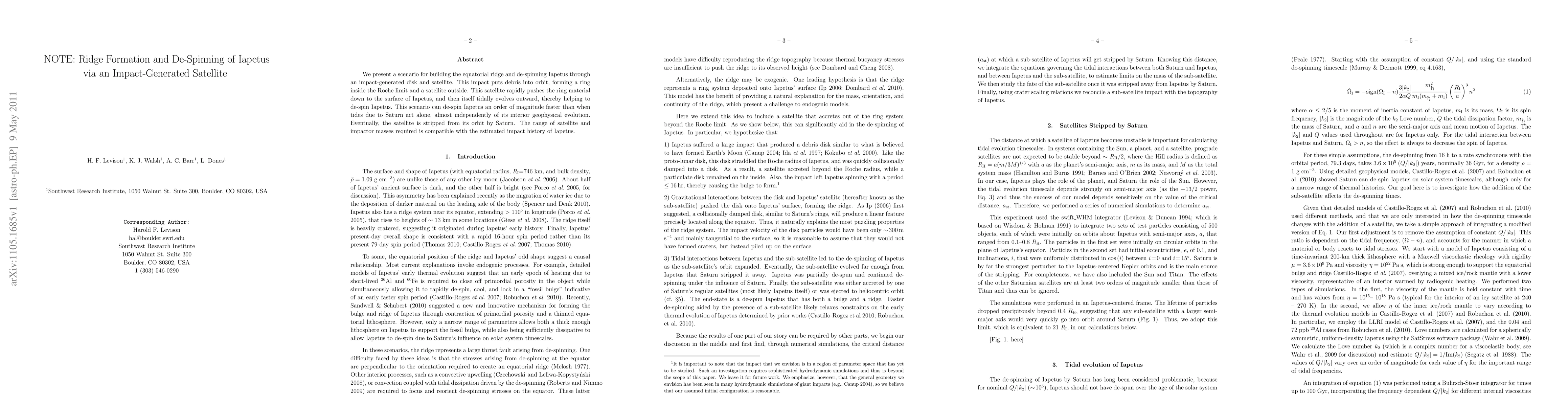 This paper proposes that an impact-generated satellite formed from debris could create Iapetus' equatorial ridge and rapidly de-spin the moon, a process much faster than Saturn's tidal forces alone, with the satellite eventually being stripped by Saturn's gravity. The suggested mass ranges for the satellite and impactor align with Iapetus' estimated impact history.