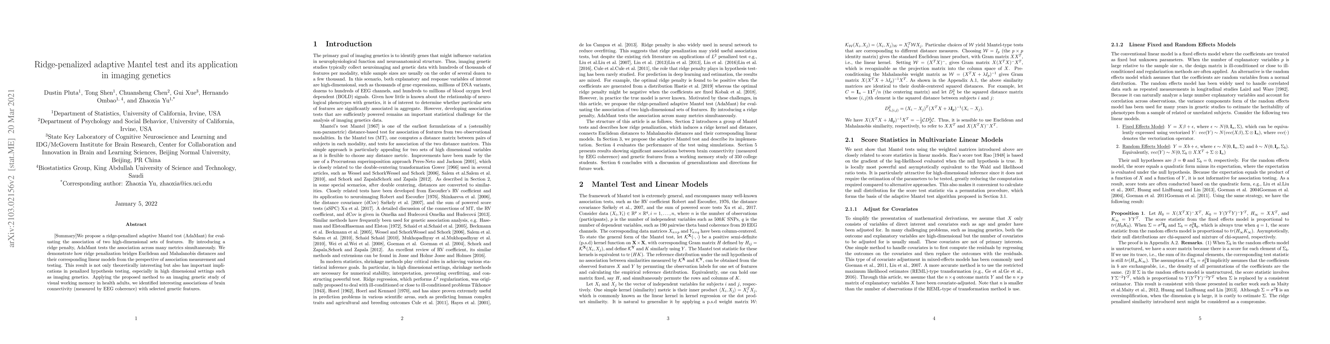 The paper proposes a ridge-penalized adaptive Mantel test (AdaMant) to evaluate associations between high-dimensional feature sets, bridging Euclidean and Mahalanobis distances. The method is applied to an imaging genetics study, revealing associations between brain connectivity and genetic features in visual working memory tasks.