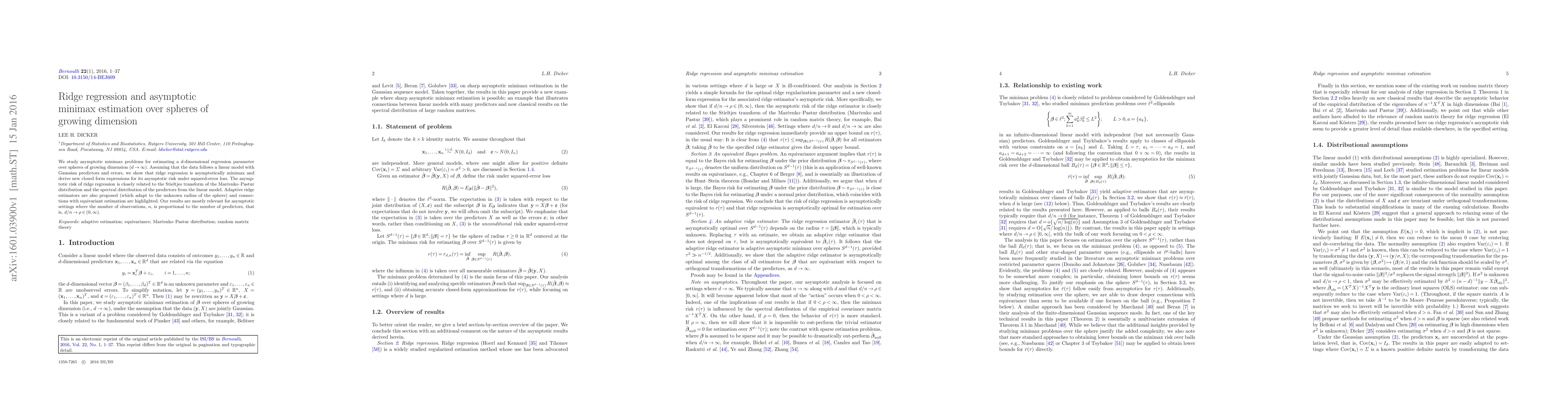 This paper investigates asymptotic minimax estimation for a $d$-dimensional regression parameter over growing spheres, demonstrating that ridge regression is asymptotically minimax under Gaussian predictors and errors. It provides new expressions for the asymptotic risk and proposes adaptive ridge estimators, highlighting connections with equivariant estimation.