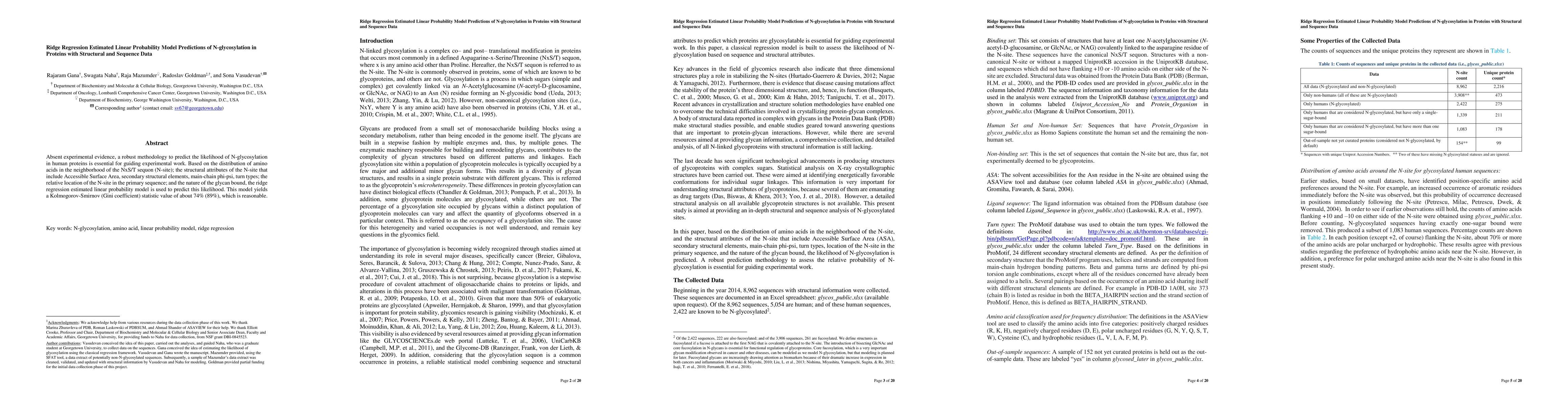 Absent experimental evidence, a robust methodology to predict the likelihood of N-glycosylation in human proteins is essential for guiding experimental work. Based on the distribution of amino acids in the neighborhood of the NxS/T sequon (N-site); the structural attributes of the N-site that include Accessible Surface Area, secondary structural elements, main-chain phi-psi, turn types; the relative location of the N-site in the primary sequence; and the nature of the glycan bound, the ridge regression estimated linear probability model is used to predict this likelihood. This model yields a Kolmogorov-Smirnov (Gini coefficient) statistic value of about 74% (89%), which is reasonable.