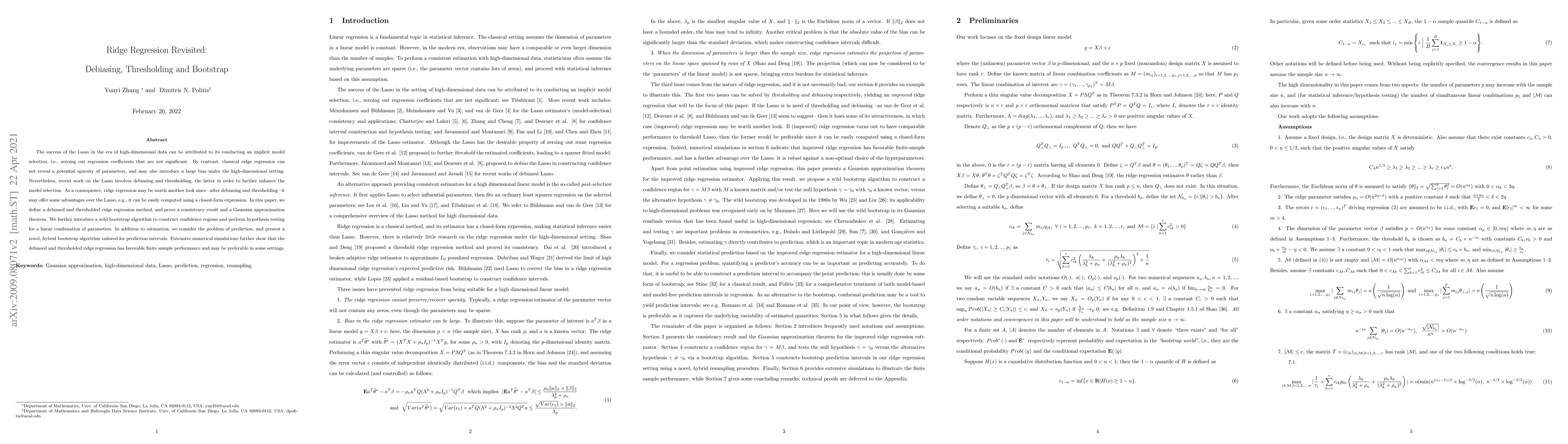 This paper revisits ridge regression by proposing a debiased and thresholded method that enhances its performance in high-dimensional settings. The authors demonstrate its advantages over the Lasso, including ease of computation and comparable performance, and introduce a wild bootstrap algorithm for hypothesis testing and prediction intervals.