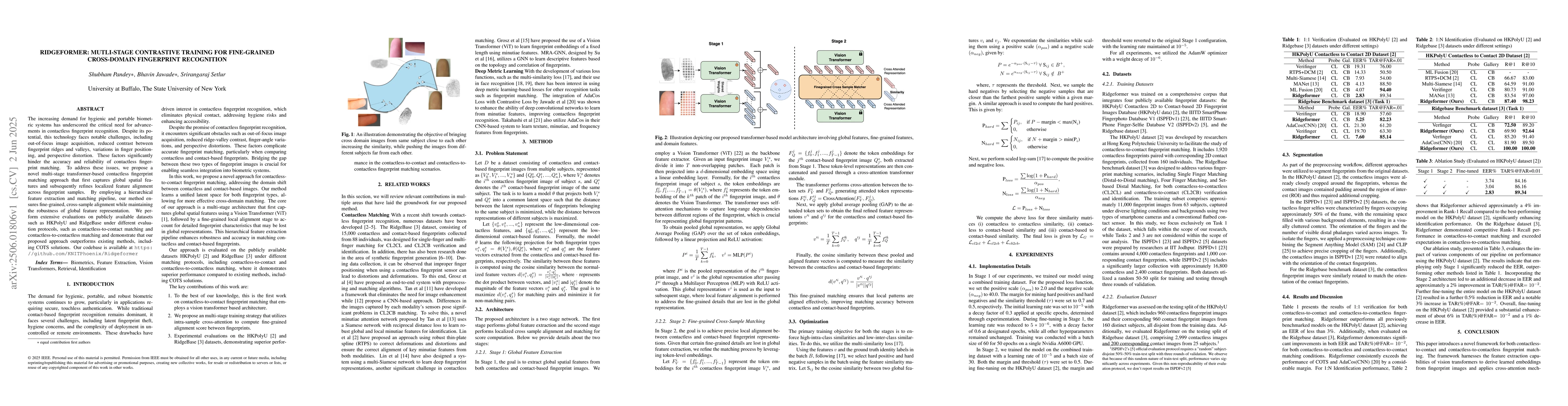 The paper introduces Ridgeformer, a transformer-based method for improving contactless fingerprint recognition. It tackles challenges like out-of-focus images, low contrast, and position variations by using a multi-stage approach to first capture global features and then refine localized alignments. Ridgeformer outperforms existing methods in tests on HKPolyU and RidgeBase datasets, demonstrating better accuracy and reliability for contactless fingerprint matching.