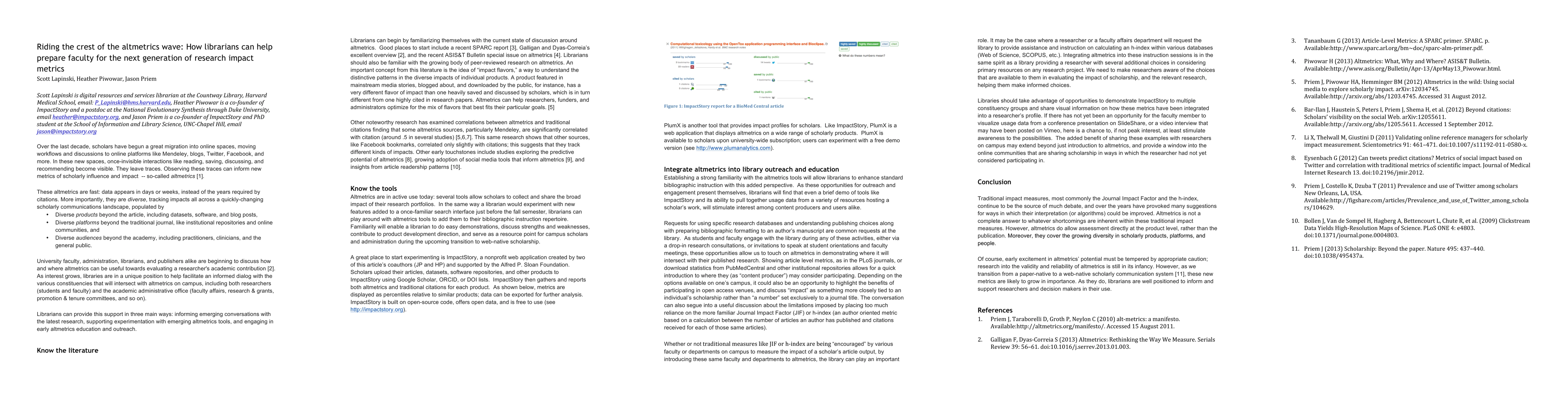As scholars migrate into online spaces like Mendeley, blogs, Twitter, and more, they leave new traces of once-invisible interactions like reading, saving, discussing, and recommending. Observing these traces can inform new metrics of scholarly influence and impact -- so-called "altmetrics." Stakeholders in academia are beginning to discuss how and where altmetrics can be useful towards evaluating a researcher's academic contribution. As this interest grows, libraries are in a unique position to help support an informed dialog on campus. We suggest that librarians can provide this support in three main ways: informing emerging conversations with the latest research, supporting experimentation with emerging altmetrics tools, and engaging in early altmetrics education and outreach. We include examples and lists of resources to help librarians fill these roles.