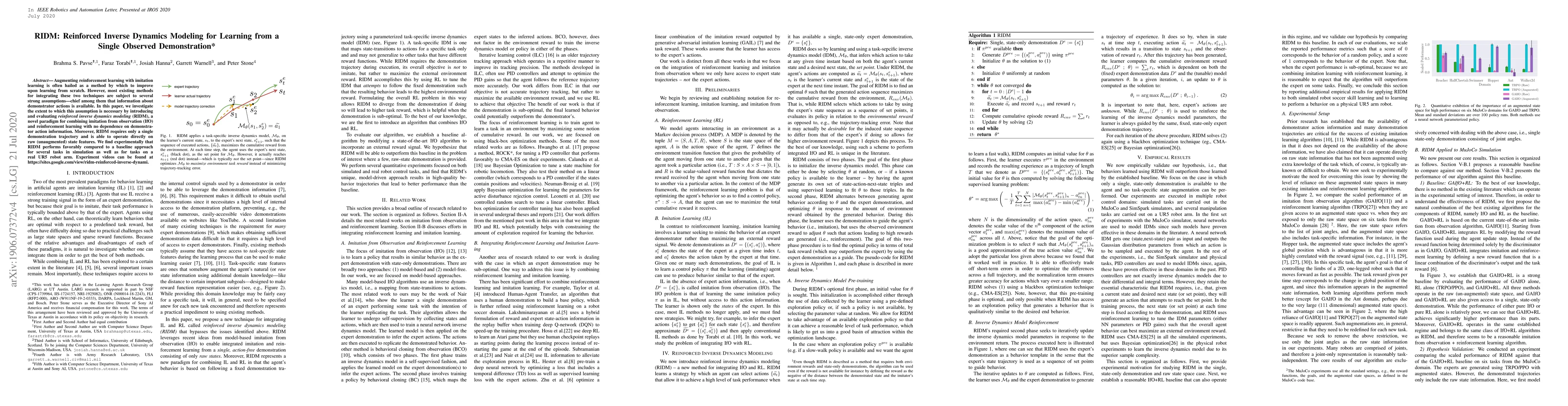 A new method called Reinforced Inverse Dynamics Modeling (RIDM) combines imitation learning from observation with reinforcement learning without relying on demonstrator action information. RIDM performs well on several tasks in simulation and a real robot arm, using only a single demonstration trajectory.