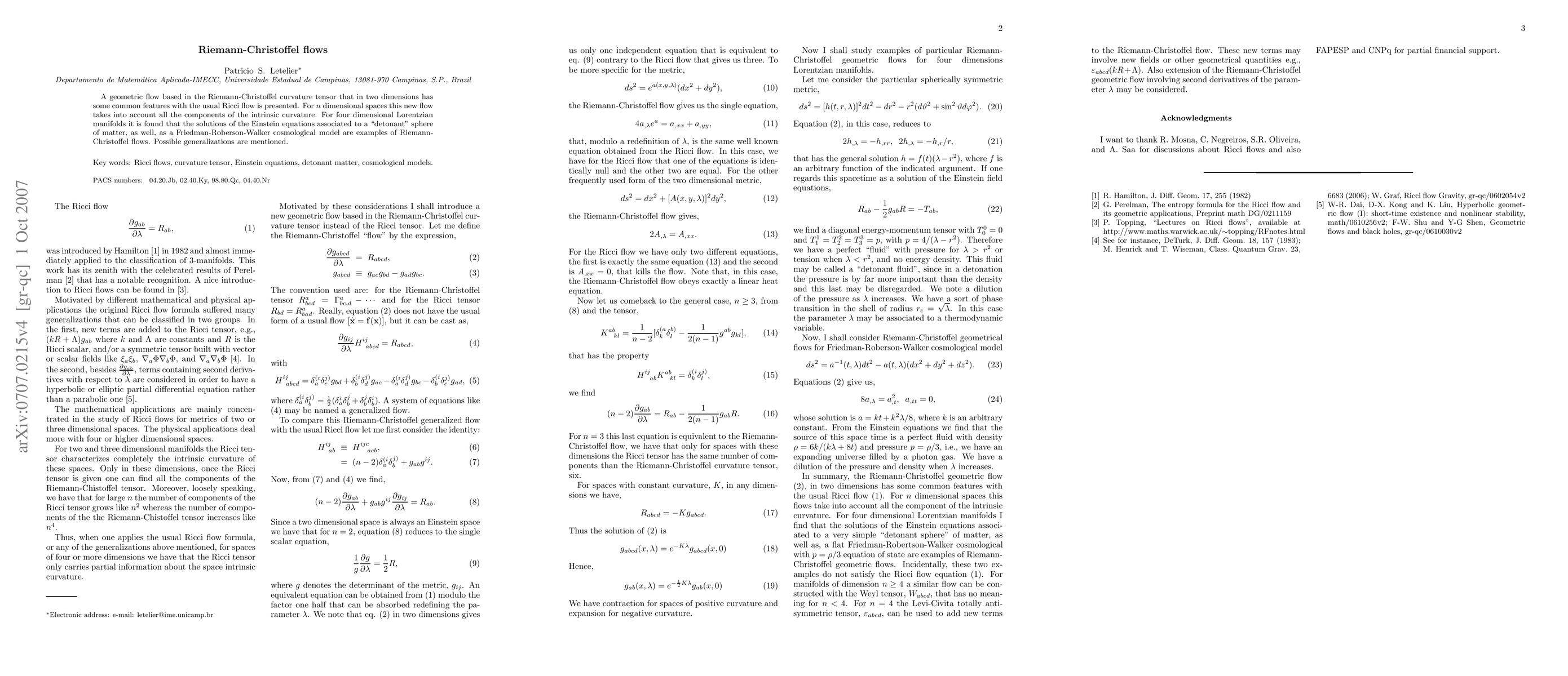 A geometric flow based in the Riemann-Christoffel curvature tensor that in two dimensions has some common features with the usual Ricci flow is presented. For $n$ dimensional spaces this new flow takes into account all the components of the intrinsic curvature. For four dimensional Lorentzian manifolds it is found that the solutions of the Einstein equations associated to a "detonant" sphere of matter, as well, as a Friedman-Roberson-Walker cosmological model are examples of Riemann-Christoffel flows. Possible generalizations are mentioned.