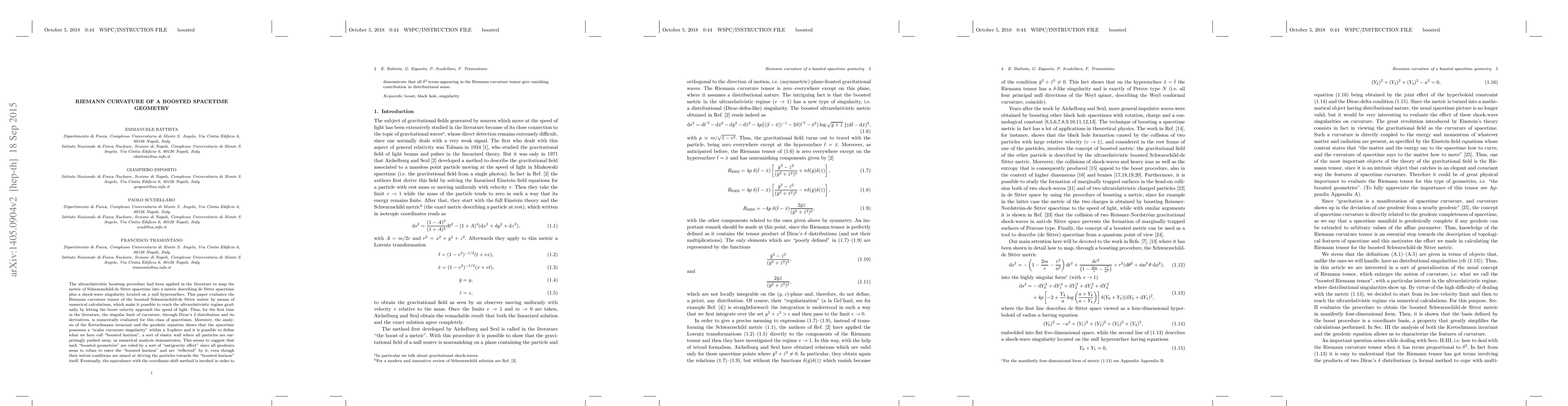 The ultrarelativistic boosting procedure had been applied in the literature to map the metric of Schwarzschild-de Sitter spacetime into a metric describing de Sitter spacetime plus a shock-wave singularity located on a null hypersurface. This paper evaluates the Riemann curvature tensor of the boosted Schwarzschild-de Sitter metric by means of numerical calculations, which make it possible to reach the ultrarelativistic regime gradually by letting the boost velocity approach the speed of light. Thus, for the first time in the literature, the singular limit of curvature through Dirac's delta distribution and its derivatives is numerically evaluated for this class of spacetimes. Eventually, the analysis of the Kretschmann invariant and the geodesic equation show that the spacetime possesses a scalar curvature singularity within a 3-sphere and it is possible to define what we here call boosted horizon, a sort of elastic wall where all particles are surprisingly pushed away, as numerical analysis demonstrates. This seems to suggest that boosted geometries are ruled by a sort of antigravity effect since all geodesics seem to refuse to enter the boosted horizon, even though their initial conditions are aimed at driving the particles towards the boosted horizon.