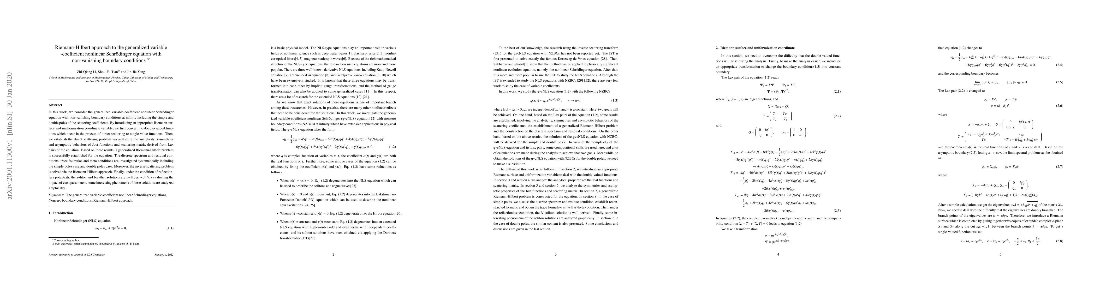 This paper employs a Riemann-Hilbert approach to solve the generalized variable-coefficient nonlinear Schrödinger equation with non-vanishing boundary conditions, including simple and double poles. It establishes a direct scattering problem and solves the inverse scattering problem, deriving soliton and breather solutions under reflection-less potentials.