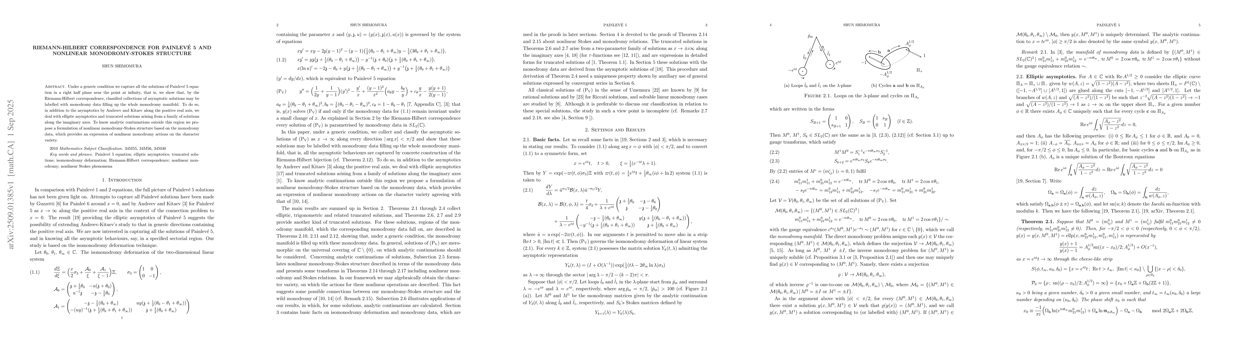 Under a generic condition we capture all the solutions of Painlev\'e 5 equation in a right half plane near the point at infinity, that is, we show that, by the Riemann-Hilbert correspondence, classified collections of asymptotic solutions may be labelled with monodromy data filling up the whole monodromy manifold. To do so, in addition to the asymptotics by Andreev and Kitaev along the positive real axis, we deal with elliptic asymptotics and truncated solutions arising from a family of solutions along the imaginary axes. To know analytic continuations outside this region we propose a formulation of nonlinear monodromy-Stokes structure based on the monodromy data, which provides an expression of nonlinear monodromy actions on the character variety.