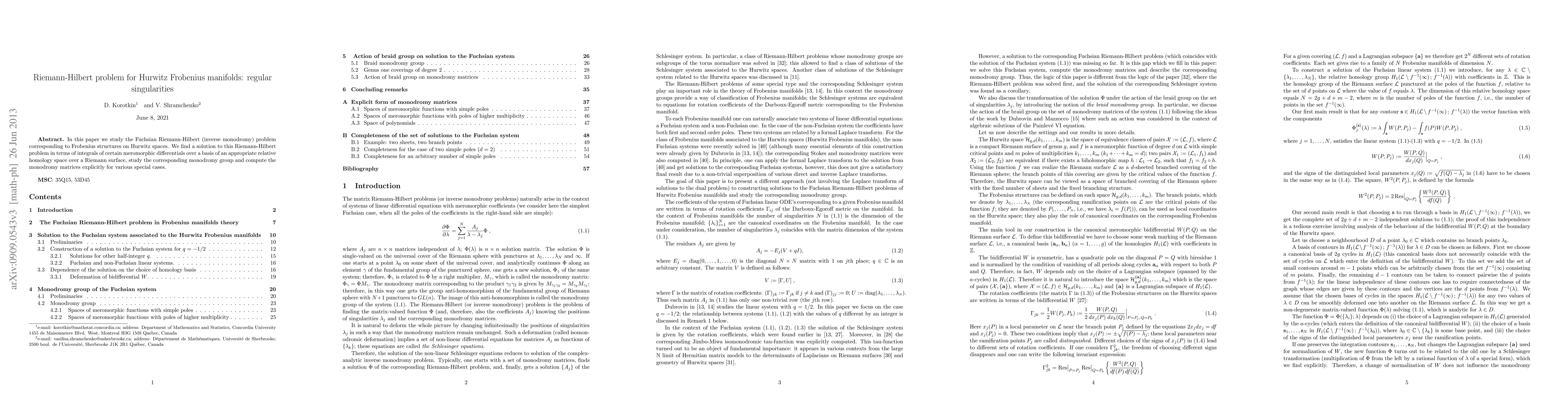 This paper solves the Riemann-Hilbert problem for Hurwitz Frobenius manifolds with regular singularities by expressing the solution in terms of integrals of meromorphic differentials, and explicitly computes the monodromy matrices for specific cases.