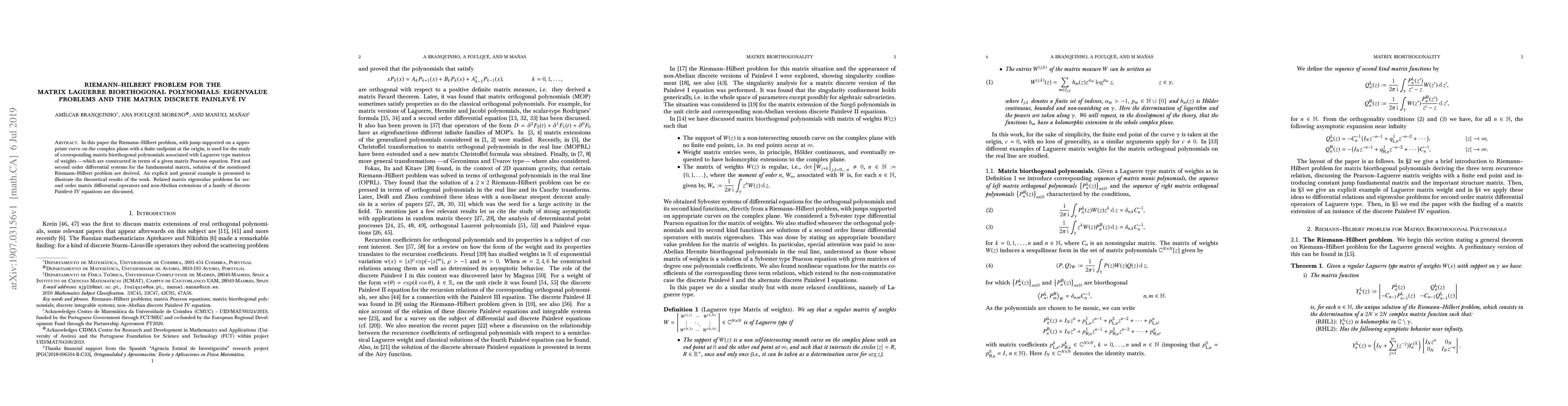 This paper applies the Riemann-Hilbert problem to study matrix biorthogonal polynomials linked to Laguerre type matrices, deriving differential systems for their fundamental matrix solutions. It also explores related matrix eigenvalue problems and non-Abelian extensions of discrete Painlevé IV equations.