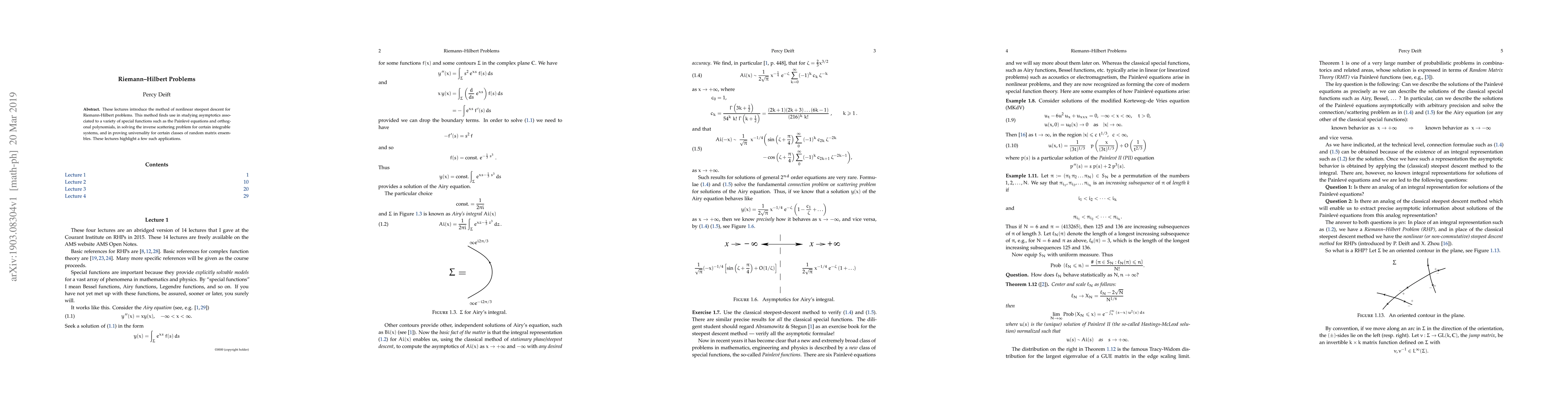 The paper introduces the nonlinear steepest descent method for Riemann-Hilbert problems, illustrating its applications in the asymptotic analysis of special functions, integrable systems, and random matrix ensembles. This method aids in solving inverse scattering problems and proving universality.