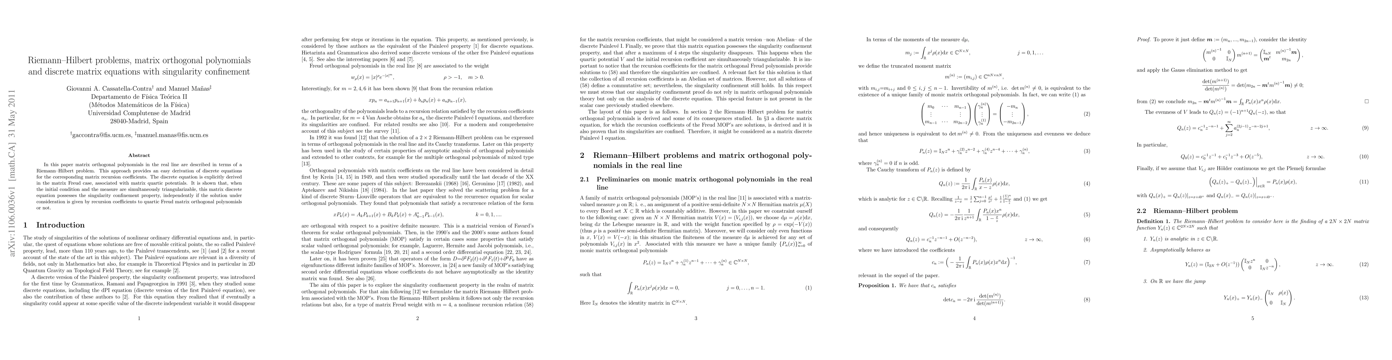 This paper connects matrix orthogonal polynomials to Riemann-Hilbert problems, deriving discrete equations for matrix recursion coefficients. It specifically focuses on the matrix Freud case with quartic potentials, demonstrating singularity confinement under certain conditions.