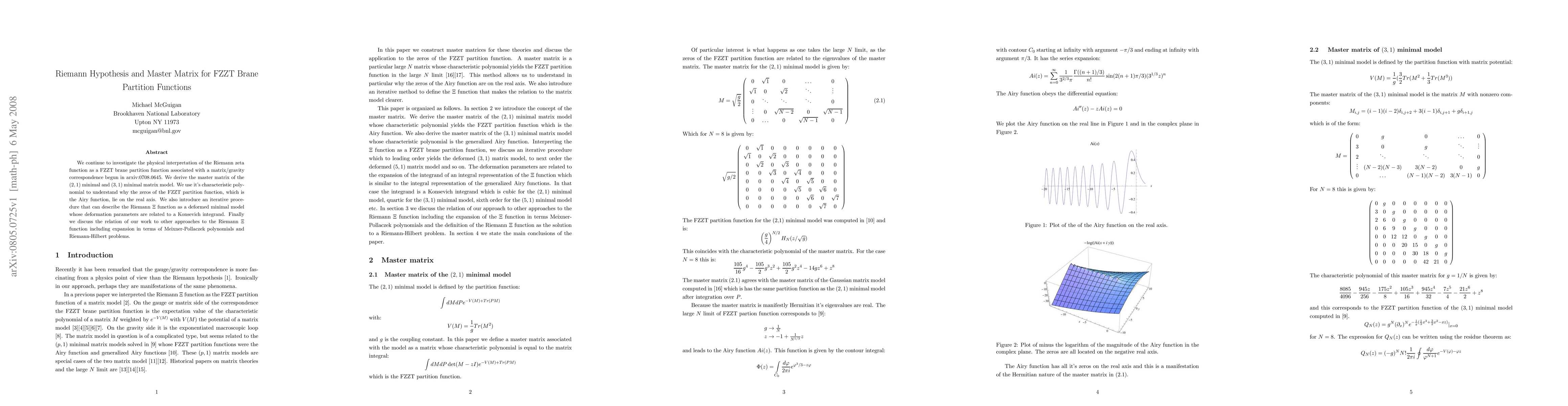 We continue to investigate the physical interpretation of the Riemann zeta function as a FZZT brane partition function associated with a matrix/gravity correspondence begun in arxiv:0708.0645. We derive the master matrix of the $(2,1)$ minimal and $(3,1)$ minimal matrix model. We use it's characteristic polynomial to understand why the zeros of the FZZT partition function, which is the Airy function, lie on the real axis. We also introduce an iterative procedure that can describe the Riemann $\Xi$ function as a deformed minimal model whose deformation parameters are related to a Konsevich integrand. Finally we discuss the relation of our work to other approaches to the Riemann $\Xi$ function including expansion in terms of Meixner-Pollaczek polynomials and Riemann-Hilbert problems.