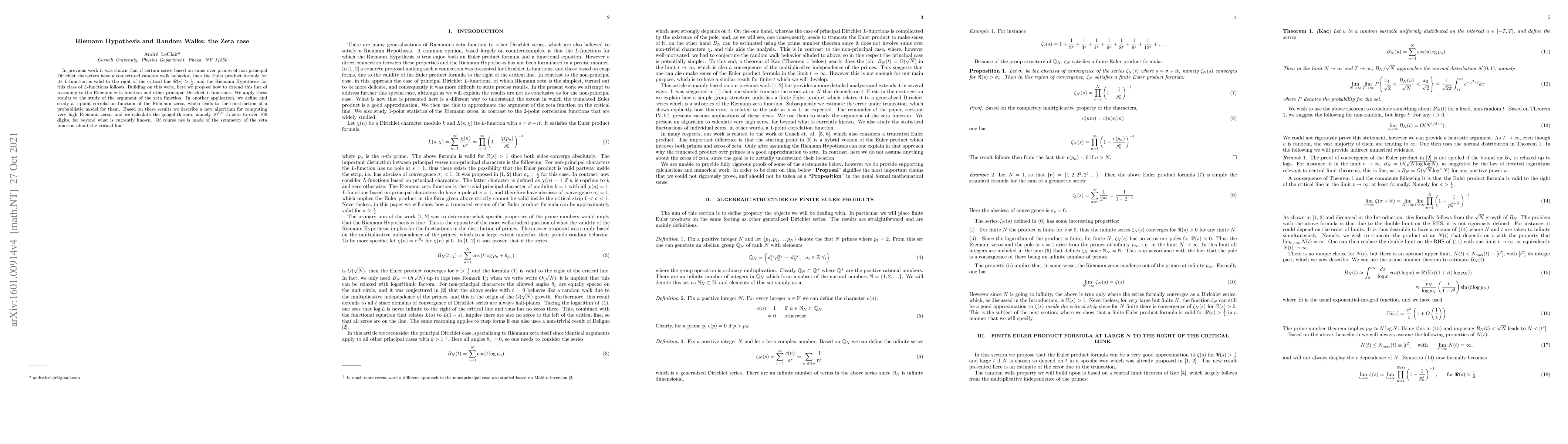 In previous work it was shown that if certain series based on sums over primes of non-principal Dirichlet characters have a conjectured random walk behavior, then the Euler product formula for its $L$-function is valid to the right of the critical line $\Re (s) > \tfrac{1}{2}$, and the Riemann Hypothesis for this class of $L$-functions follows. Building on this work, here we propose how to extend this line of reasoning to the Riemann zeta function and other principal Dirichlet $L$-functions. We apply these results to the study of the argument of the zeta function. In another application, we define and study a 1-point correlation function of the Riemann zeros, which leads to the construction of a probabilistic model for them. Based on these results we describe a new algorithm for computing very high Riemann zeros, and we calculate the googol-th zero, namely $10^{100}$-th zero to over 100 digits, far beyond what is currently known.