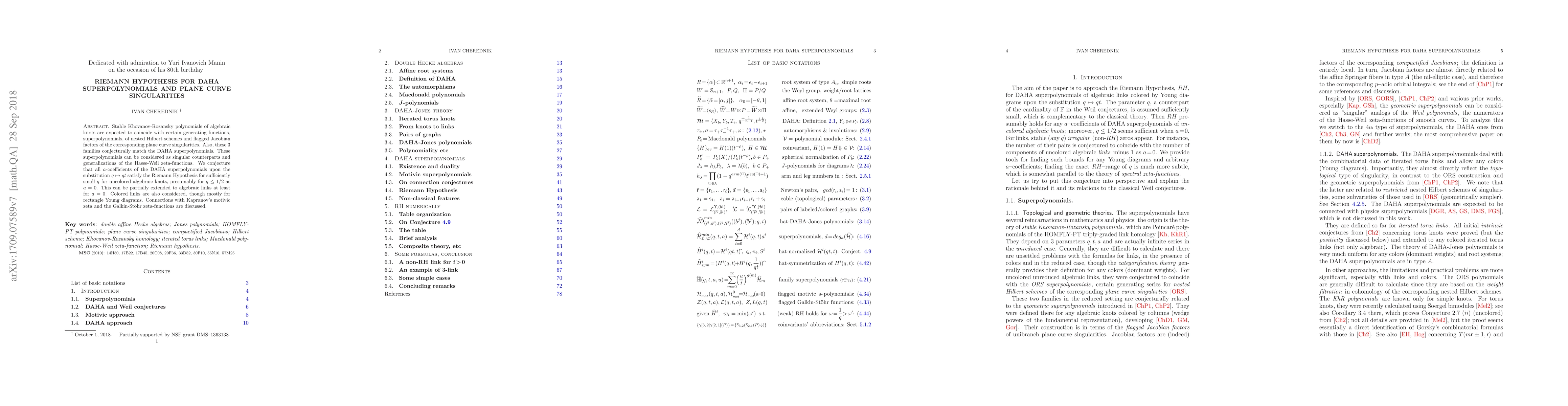 This paper explores the conjectured equivalence between stable Khovanov-Rozansky polynomials, DAHA superpolynomials, and generating functions for plane curve singularities, suggesting a Riemann Hypothesis for the $a$-coefficients of these superpolynomials for uncolored algebraic knots. Connections to motivic zeta and related zeta functions are also examined.