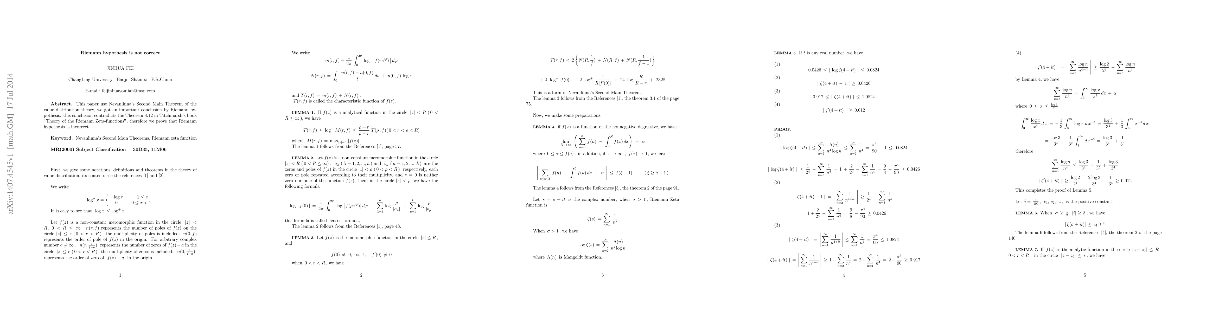 This paper use Nevanlinna's Second Main Theorem of the value distribution theory, we got an important conclusion by Riemann hypothesis. this conclusion contradicts the Theorem 8.12 in Titchmarsh's book "Theory of the Riemann Zeta-functions", therefore we prove that Riemann hypothesis is incorrect.