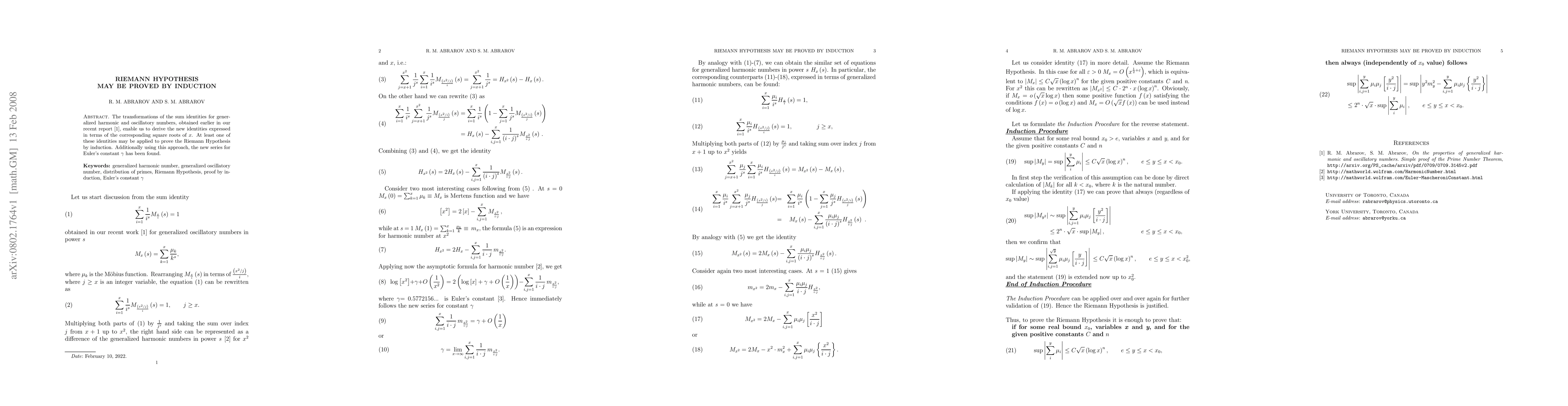 The transformations of the sum identities for generalized harmonic and oscillatory numbers, obtained earlier in our recent report [1], enable us to derive the new identities expressed in terms of the corresponding square roots of x. At least one of these identities may be applied to prove the Riemann Hypothesis by induction. Additionally using this approach, the new series for Euler's constant gamma has been found.