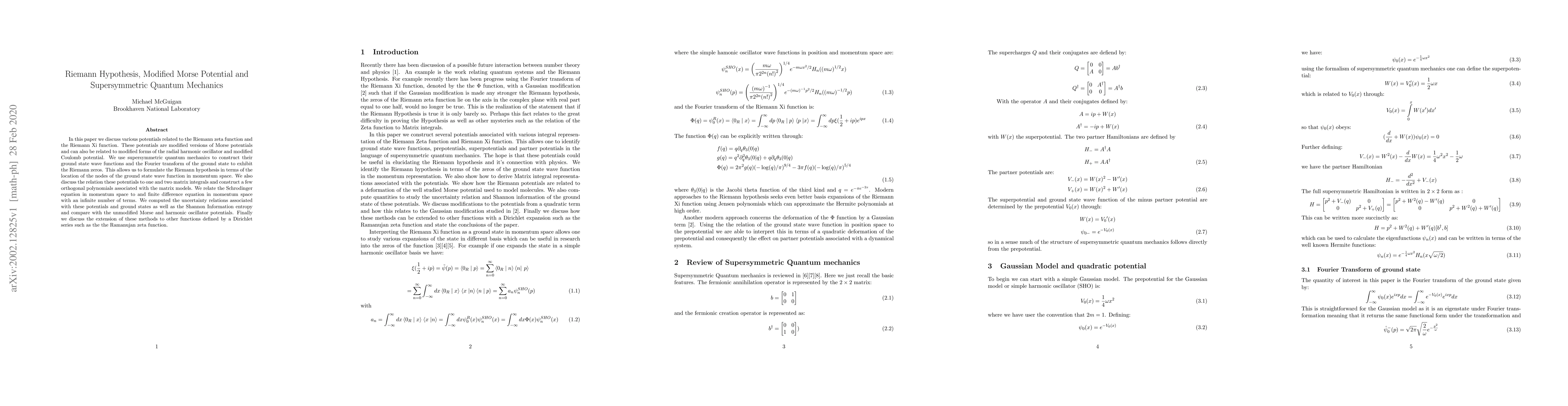 This paper explores modified Morse potentials linked to the Riemann zeta and Xi functions, employing supersymmetric quantum mechanics to construct ground state wave functions. It connects the Riemann hypothesis to the nodes of these wave functions in momentum space and extends the analysis to matrix integrals and orthogonal polynomials.