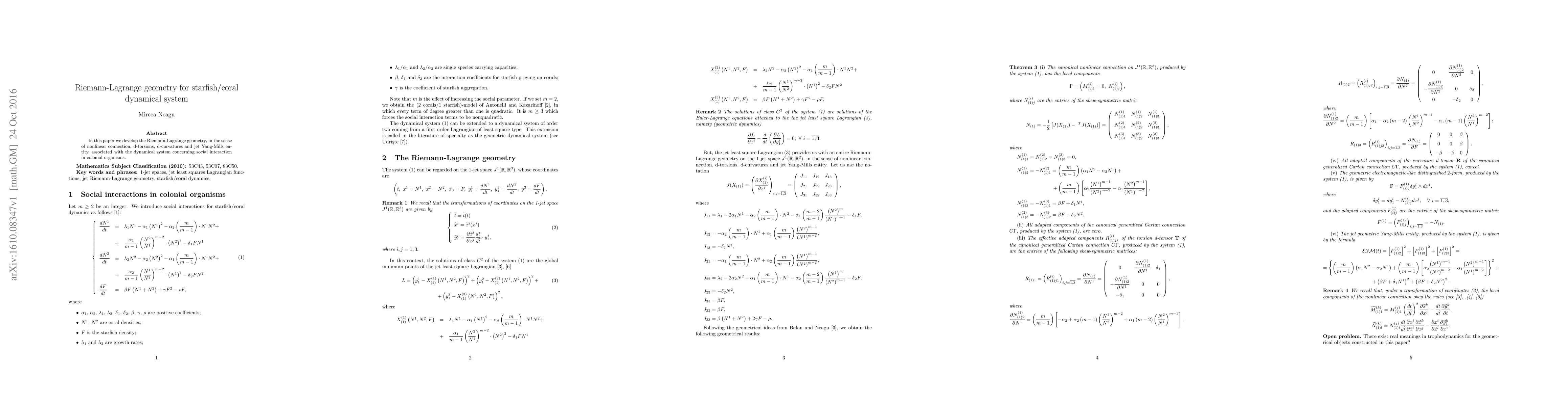 This paper introduces Riemann-Lagrange geometry to model the dynamics of social interactions in colonial organisms like starfish and coral, focusing on nonlinear connections, d-torsions, d-curvatures, and jet Yang-Mills entities. This novel geometric framework aims to better understand the complex interactions within these colonial systems.