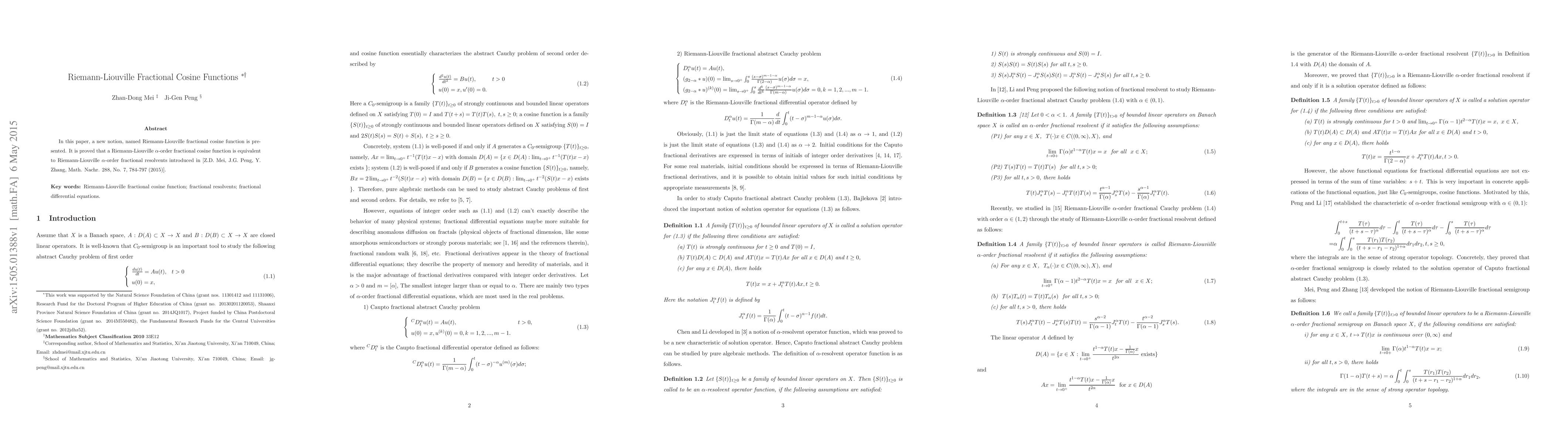 This paper introduces the Riemann-Liouville fractional cosine function and demonstrates its equivalence to the Riemann-Liouville $\alpha$-order fractional resolvents as presented in a previous study by Mei, Peng, and Zhang.