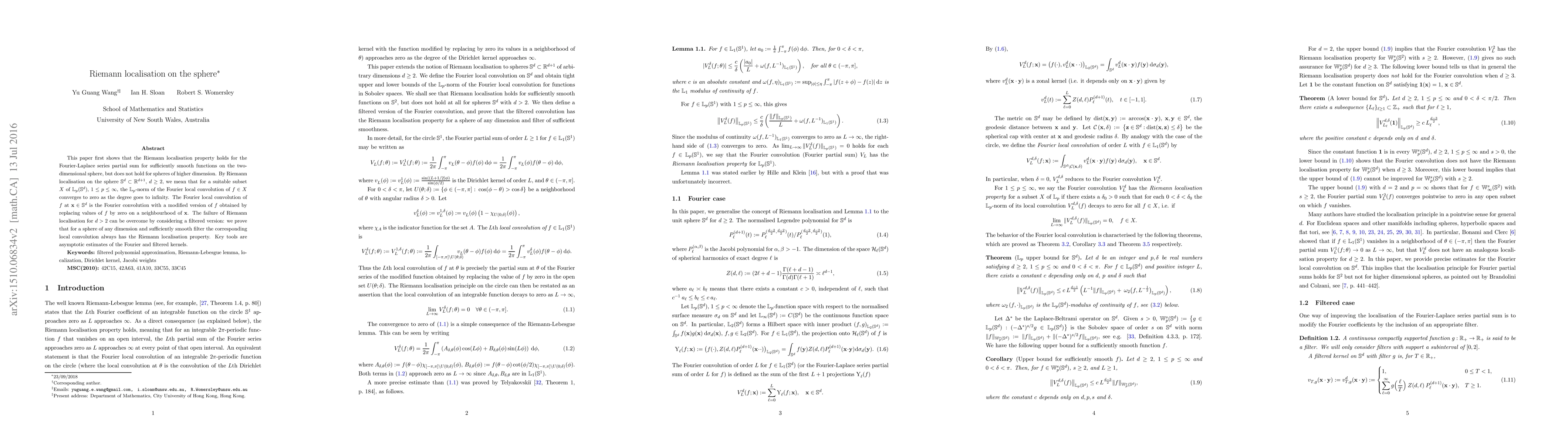 This paper demonstrates that the Riemann localisation property holds for the Fourier-Laplace series on the 2D sphere but not for higher dimensions. It introduces a filtered version that restores the property for spheres of any dimension, using asymptotic estimates of Fourier and filtered kernels.