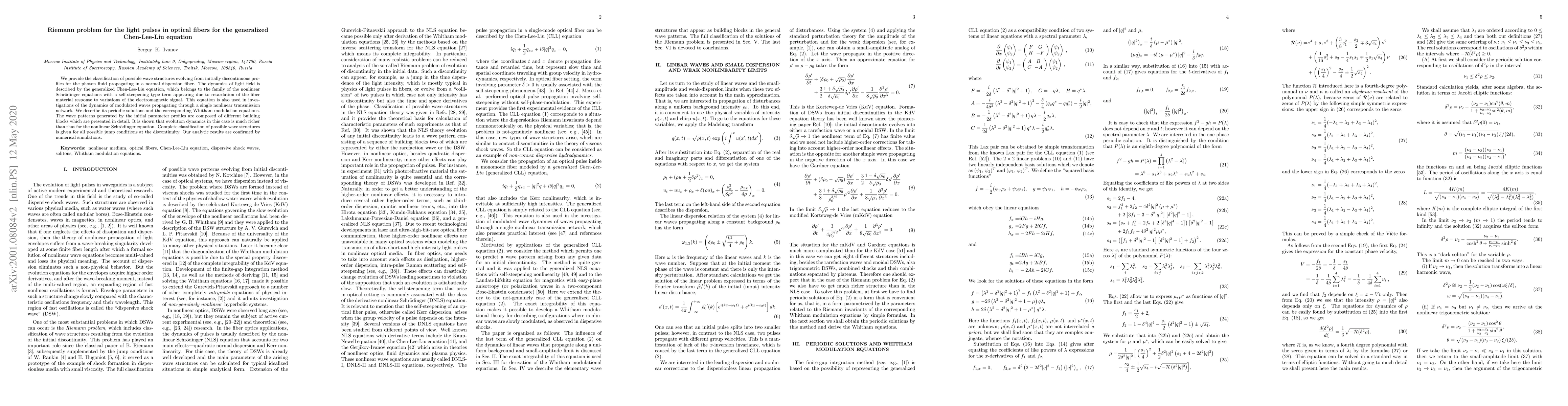 This paper classifies wave structures from discontinuous initial profiles in optical fibers using the generalized Chen-Lee-Liu equation, revealing richer dynamics than the nonlinear Schrödinger equation. It provides periodic solutions and confirms analytic results with numerical simulations.