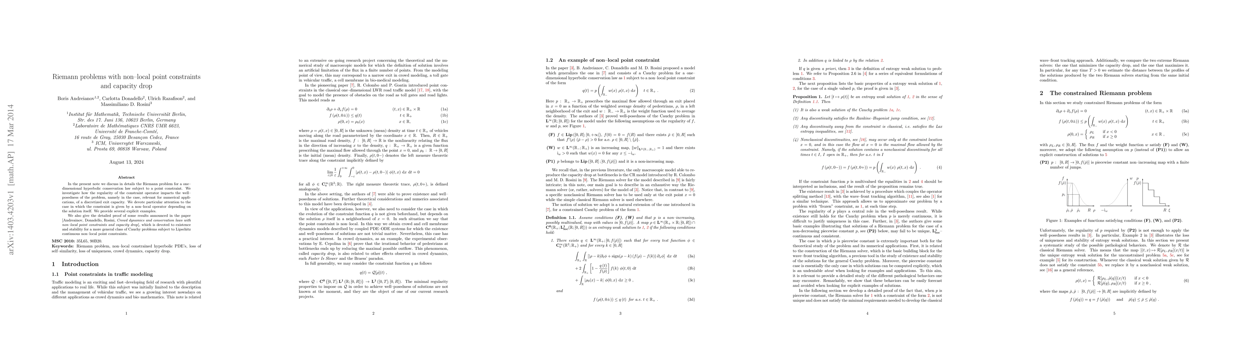 This research paper delves into the Riemann problem for a one-dimensional hyperbolic conservation law with a point constraint, examining how the constraint operator's regularity affects problem well-posedness. It focuses on discretized exit capacity cases and non-local operators dependent on the solution. The paper also provides explicit examples and proves results previously announced in another work on Cauchy problems with non-local point constraints.