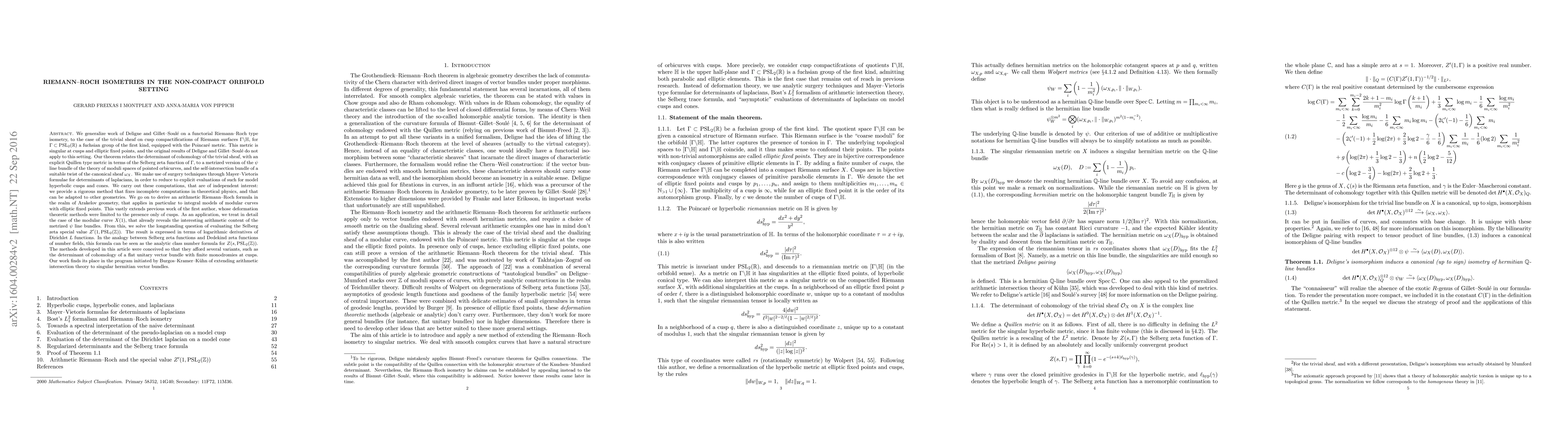 This paper establishes a generalization of Riemann-Roch isometries to non-compact orbifolds, relating the determinant of cohomology to a metric in terms of the Selberg zeta function, with applications to singular hermitian vector bundles and modular curves.