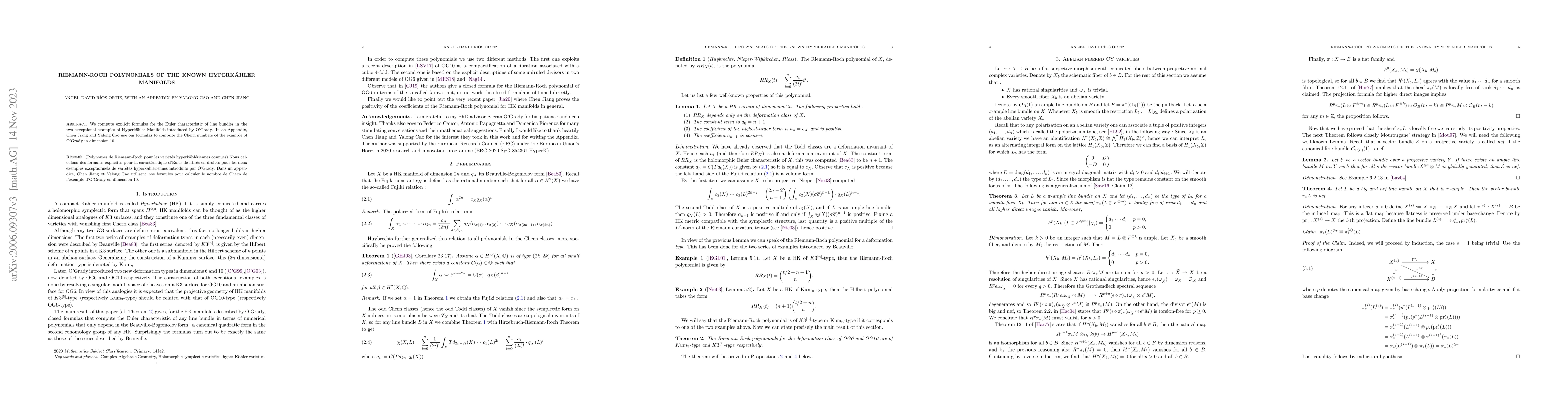This paper provides explicit formulas for the Euler characteristic of line bundles on O'Grady's exceptional Hyperkähler manifolds, and an appendix computes Chern numbers for a specific 10-dimensional example using these formulas.