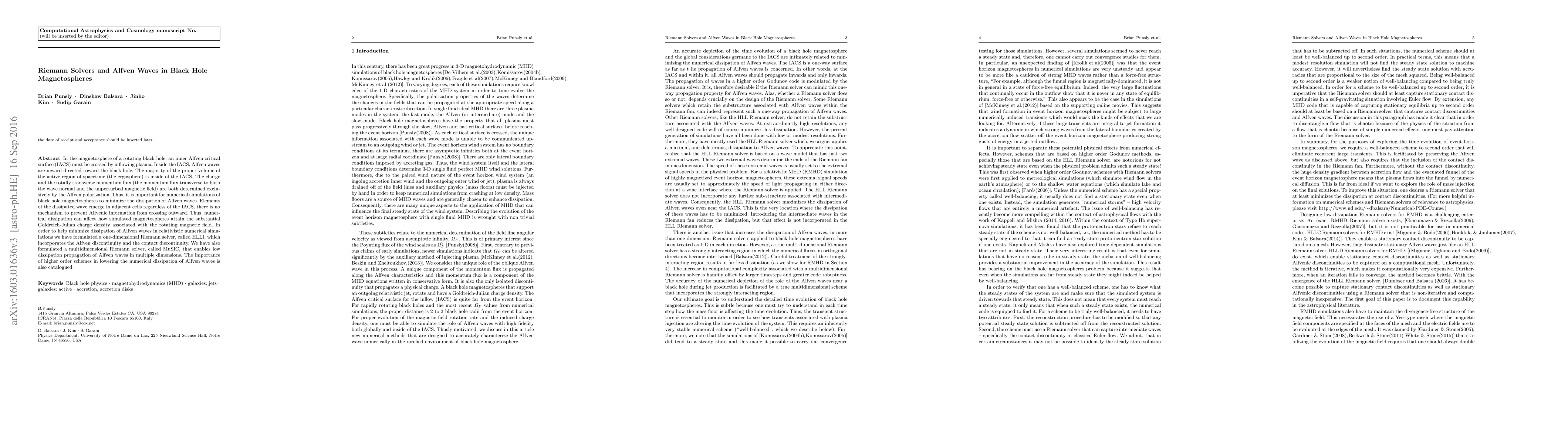In the magnetosphere of a rotating black hole, an inner Alfven critical surface (IACS) must be crossed by inflowing plasma. Inside the IACS, Alfven waves are inward directed toward the black hole. The majority of the proper volume of the active region of spacetime (the ergosphere) is inside of the IACS. The charge and the totally transverse momentum flux (the momentum flux transverse to both the wave normal and the unperturbed magnetic field) are both determined exclusively by the Alfven polarization. Thus, it is important for numerical simulations of black hole magnetospheres to minimize the dissipation of Alfven waves. Elements of the dissipated wave emerge in adjacent cells regardless of the IACS, there is no mechanism to prevent Alfvenic information from crossing outward. Thus, numerical dissipation can affect how simulated magnetospheres attain the substantial Goldreich-Julian charge density associated with the rotating magnetic field. In order to help minimize dissipation of Alfven waves in relativistic numerical simulations we have formulated a one-dimensional Riemann solver, called HLLI, which incorporates the Alfven discontinuity and the contact discontinuity. We have also formulated a multidimensional Riemann solver, called MuSIC, that enables low dissipation propagation of Alfven waves in multiple dimensions. The importance of higher order schemes in lowering the numerical dissipation of Alfven waves is also catalogued.