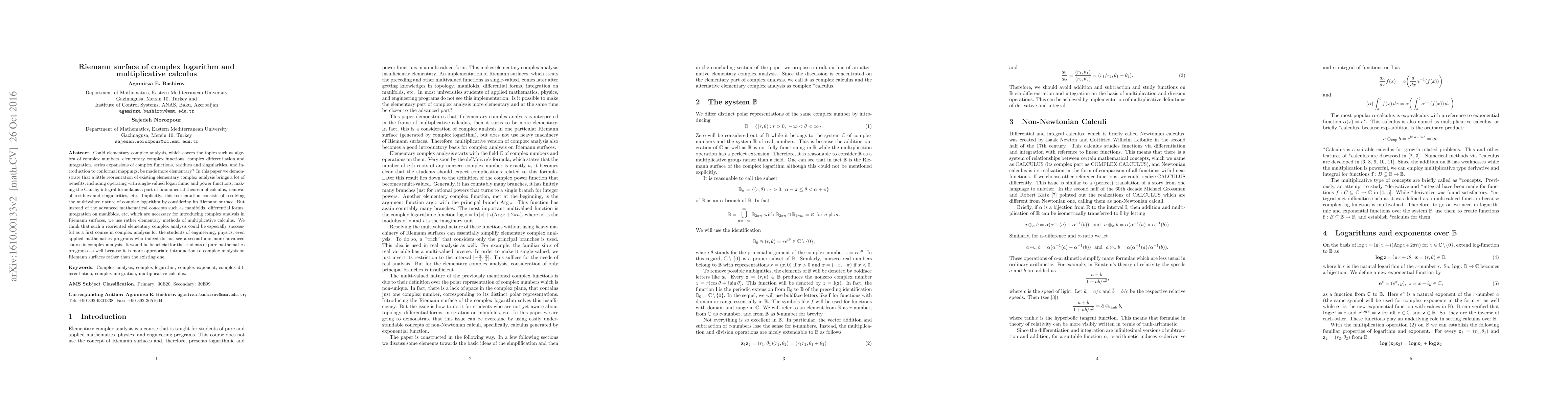 Could elementary complex analysis, which covers the topics such as algebra of complex numbers, elementary complex functions, complex differentiation and integration, series expansions of complex functions, residues and singularities, and introduction to conformal mappings, be made more elementary? In this paper we demonstrate that a little reorientation of existing elementary complex analysis brings a lot of benefits, including operating with single-valued logarithmic and power functions, making the Cauchy integral formula as a part of fundamental theorem of calculus, removal of residues and singularities, etc. Implicitly, this reorientation consists of resolving the multivalued nature of complex logarithm by considering its Riemann surface. But instead of the advanced mathematical concepts such as manifolds, differential forms, integration on manifolds, etc, which are necessary for introducing complex analysis in Riemann surfaces, we use rather elementary methods of multiplicative calculus. We think that such a reoriented elementary complex analysis could be especially successful as a first course in complex analysis for the students of engineering, physics, even applied mathematics programs who indeed do not see a second and more advanced course in complex analysis. It would be beneficial for the students of pure mathematics programs as well because it is more appropriate introduction to complex analysis on Riemann surfaces rather than the existing one.