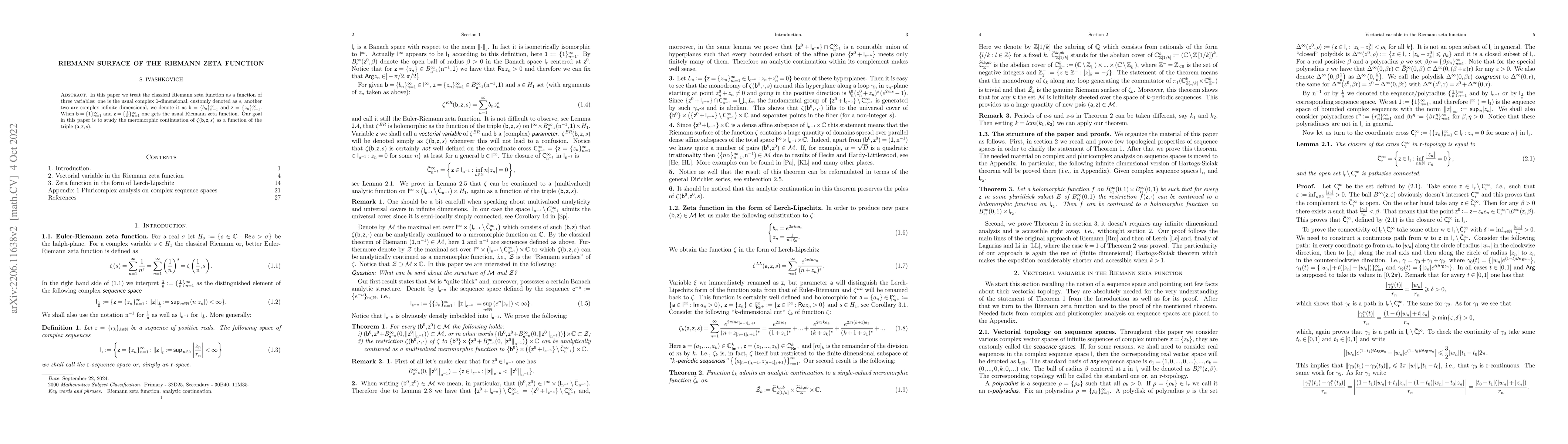 This paper explores the Riemann zeta function as a function of three variables, including a complex variable $s$ and two infinite-dimensional complex variables $\b$ and $\z$. The authors aim to study the meromorphic continuation of this extended zeta function.