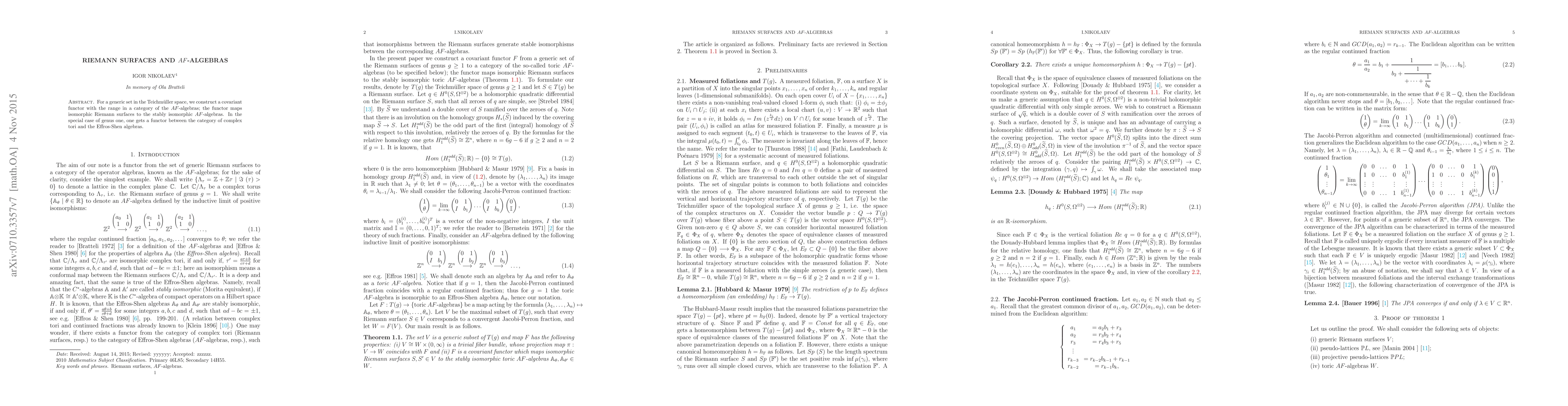 For a generic set in the Teichmueller space, we construct a covariant functor with the range in a category of the AF-algebras; the functor maps isomorphic Riemann surfaces to the stably isomorphic AF-algebras. As a special case, one gets a categorical correspondence between complex tori and the so-called Effros-Shen algebras.
