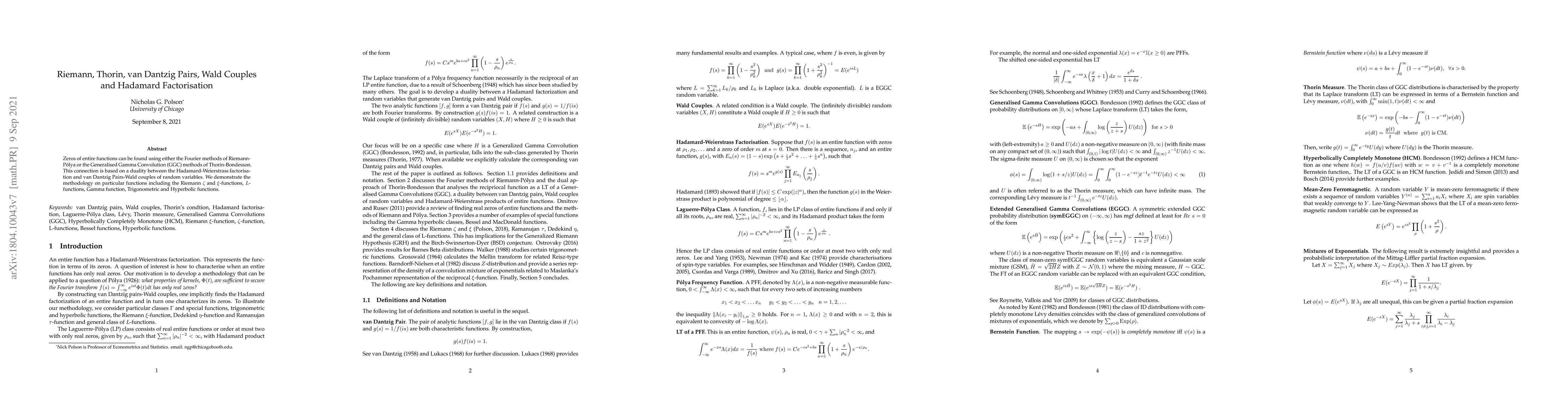 Zeros of entire functions can be found using either the Fourier methods of Riemann-Polya or the Generalized Gamma Convolution (GGC) methods of Thorin-Bondesson. This connection is based on a duality between the Hadamard-Weierstrass factorisation and van Dantzig Pairs-Wald couples of random variables. We demonstrate the methodology on particular functions including the Riemann zeta and xi-functions, Ramanujan's tau function, L-functions and Gamma and Hyperbolic functions.