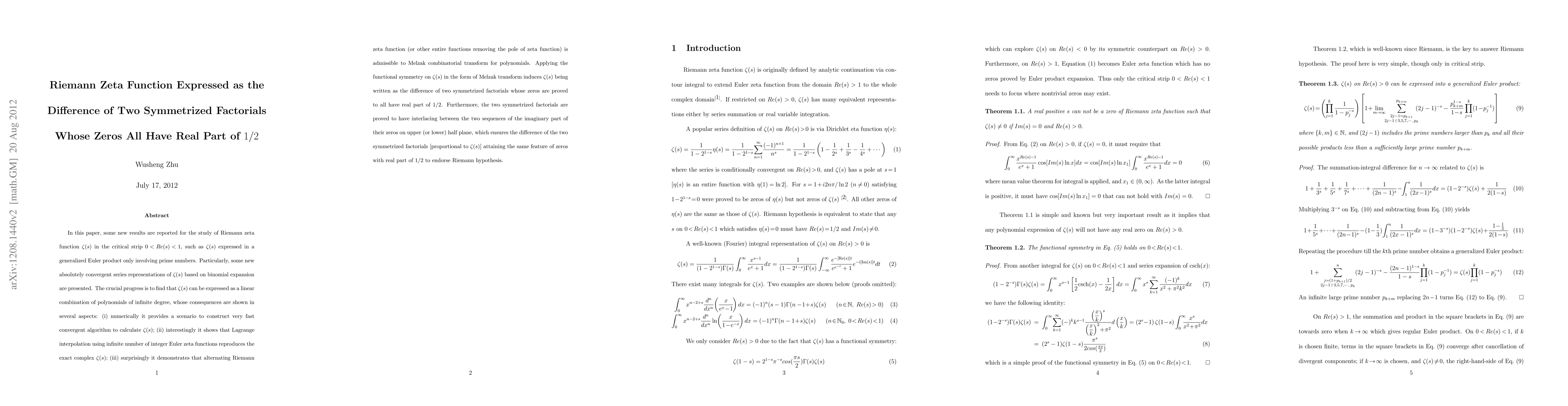 Researchers discover a new way to express the Riemann zeta function as the difference of two symmetrized factorials, which have zeros with real part 1/2, supporting the Riemann hypothesis.