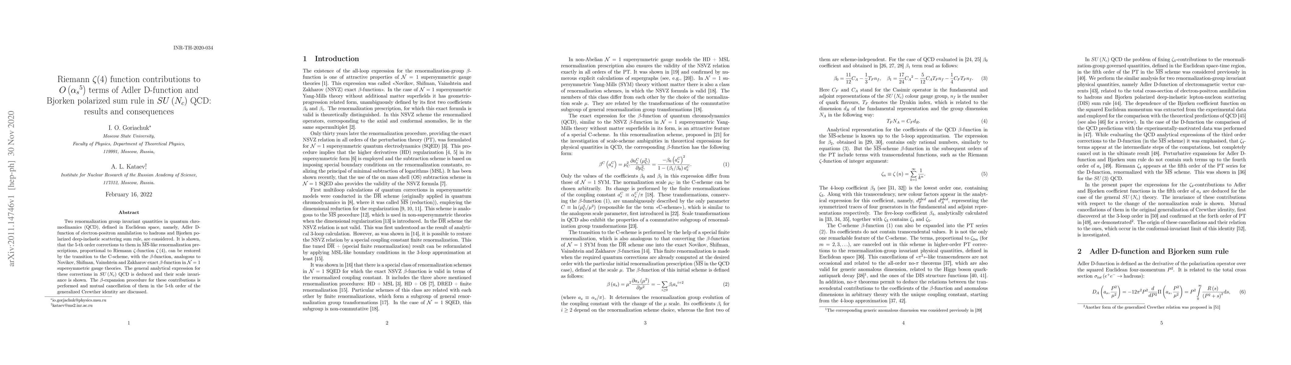 Two renormalization group invariant quantities in quantum chromodinamics (QCD), defined in Euclidean space,namely, Adler D-function of electron-positron annihilation to hadrons and Bjorken polarized deep-inelastic scattering sum rule, are considered. It is shown, that the 5-th order corrections to them in $\overline{MS}$-like renormalization prescriptions, proportional to Riemann $\zeta$-function $\zeta\left(4\right)$, can be restored by the transition to the C-scheme, with the $\beta$-function, analogous to Novikov, Shifman, Vainshtein and Zakharov exact $\beta$-function in $\mathcal{N}=1$ supersymmetric gauge theories. The general analytical expression for these corrections in $SU\left(N_c\right)$ QCD is deduced and their scale invariance is shown. The $\beta$-expansion procedure for these contributions is performed and mutual cancellation of them in the 5-th order of the generalized Crewther identity are discussed.