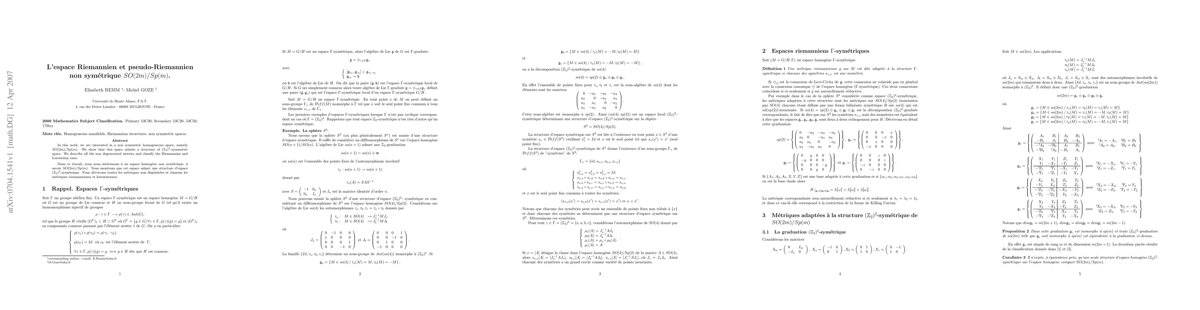In this work, we are interested in a non symmetric homogeneous space, namely $SO(2m)/Sp(m)$. We show that this space admits a structure of $Z_2^2$-symmetric space. We describe all the non degenerated metrics and classify the Riemannian and Lorentzian ones.