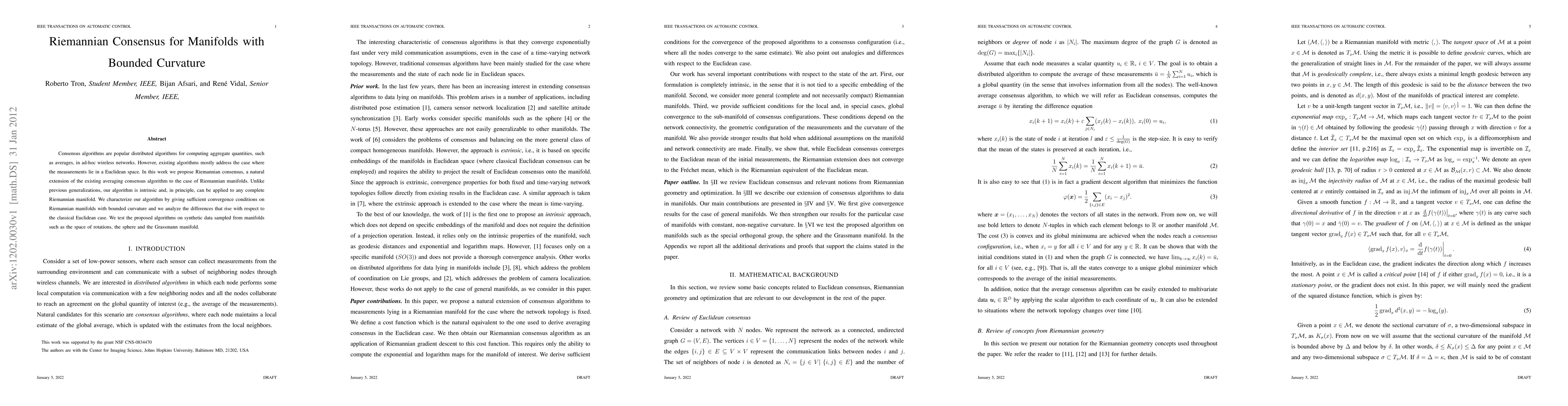 This paper proposes a Riemannian consensus algorithm for computing averages on Riemannian manifolds with bounded curvature, extending traditional consensus methods from Euclidean to non-Euclidean spaces. The intrinsic algorithm is tested on synthetic data from manifolds like the space of rotations, the sphere, and the Grassmann manifold.