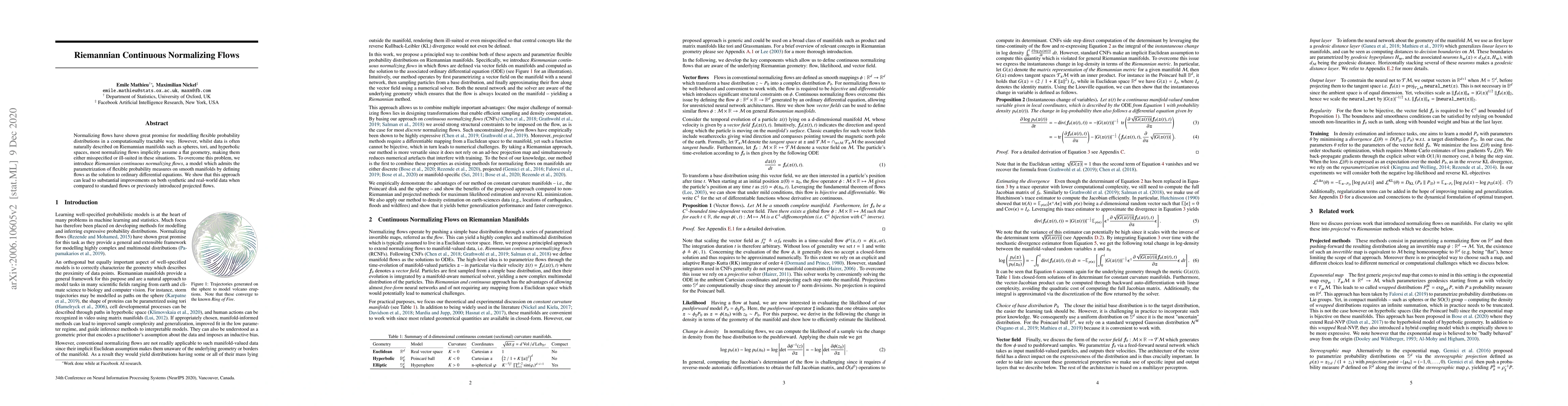 This paper introduces Riemannian continuous normalizing flows to model flexible probability distributions on Riemannian manifolds, addressing the limitation of standard normalizing flows that assume flat geometry. The proposed model defines flows as solutions to ordinary differential equations, leading to significant improvements on synthetic and real-world data compared to traditional methods.