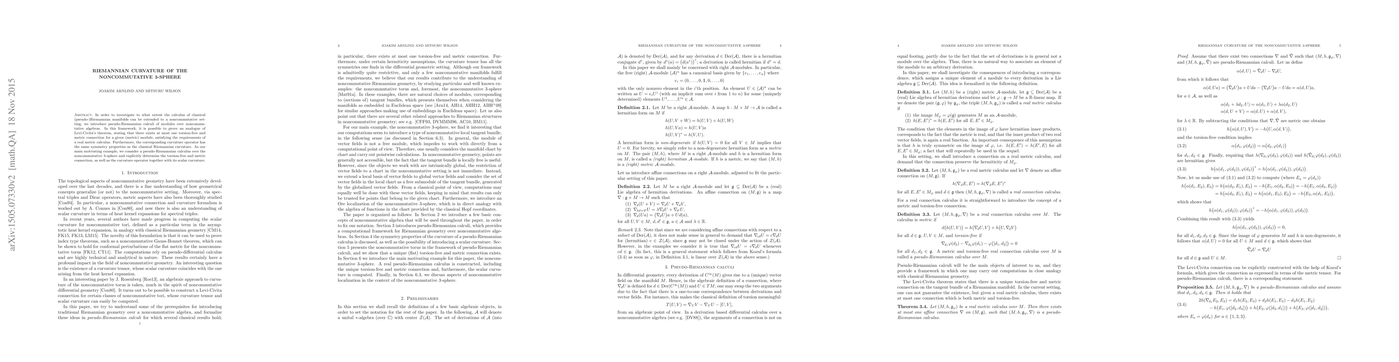In order to investigate to what extent the calculus of classical (pseudo-)Riemannian manifolds can be extended to a noncommutative setting, we introduce pseudo-Riemannian calculi of modules over noncommutative algebras. In this framework, it is possible to prove an analogue of Levi-Civita's theorem, stating that there exists at most one torsion-free and metric connection for a given (metric) module, satisfying the requirements of a real metric calculus. Furthermore, the corresponding curvature operator has the same symmetry properties as the classical Riemannian curvature. As our main motivating example, we consider a pseudo-Riemannian calculus over the noncommutative 3-sphere and explicitly determine the torsion-free and metric connection, as well as the curvature operator together with its scalar curvature.