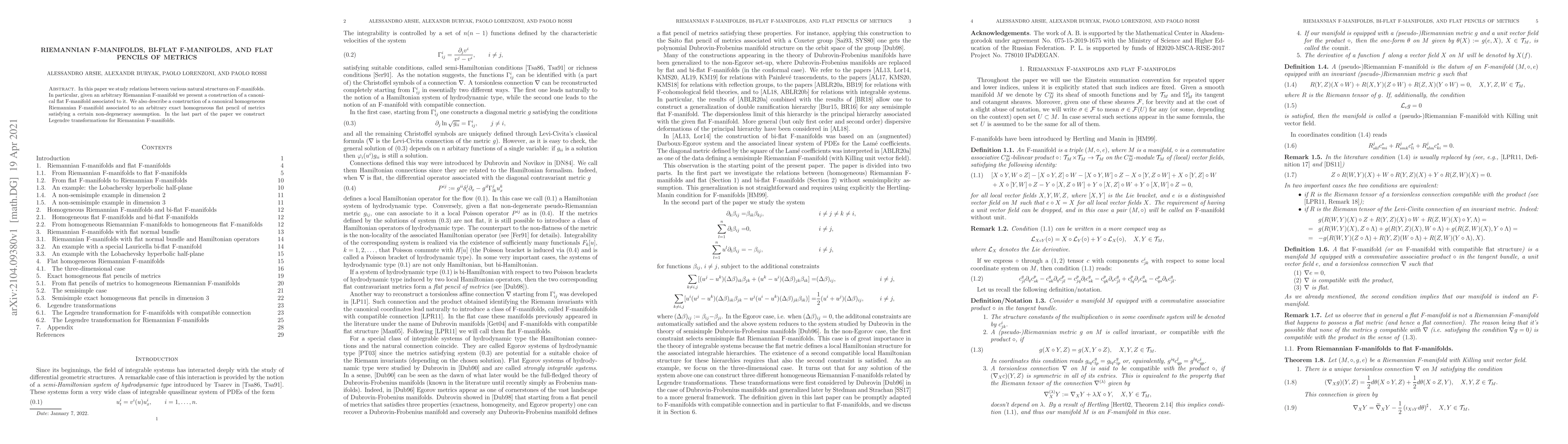 This paper explores the relationships between Riemannian F-manifolds, bi-flat F-manifolds, and flat pencils of metrics, presenting constructions for canonical flat F-manifolds and homogeneous Riemannian F-manifolds, along with Legendre transformations for Riemannian F-manifolds.