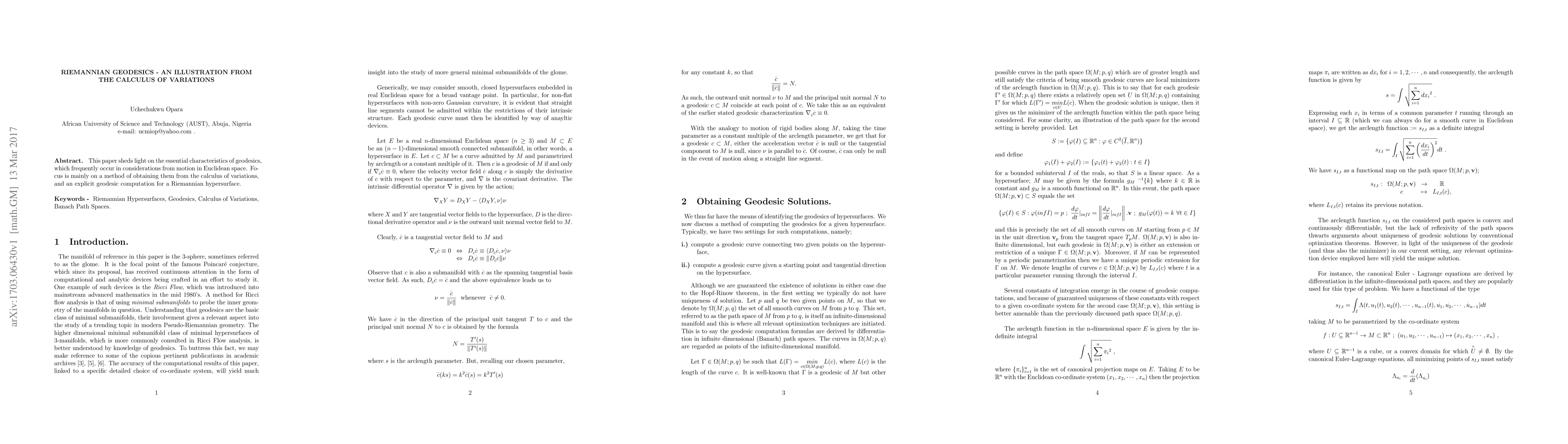 This paper sheds light on the essential characteristics of geodesics, which frequently occur in considerations from motion in Euclidean space. Focus is mainly on a method of obtaining them from the calculus of variations, and an explicit geodesic computation for a Riemannian hypersurface.