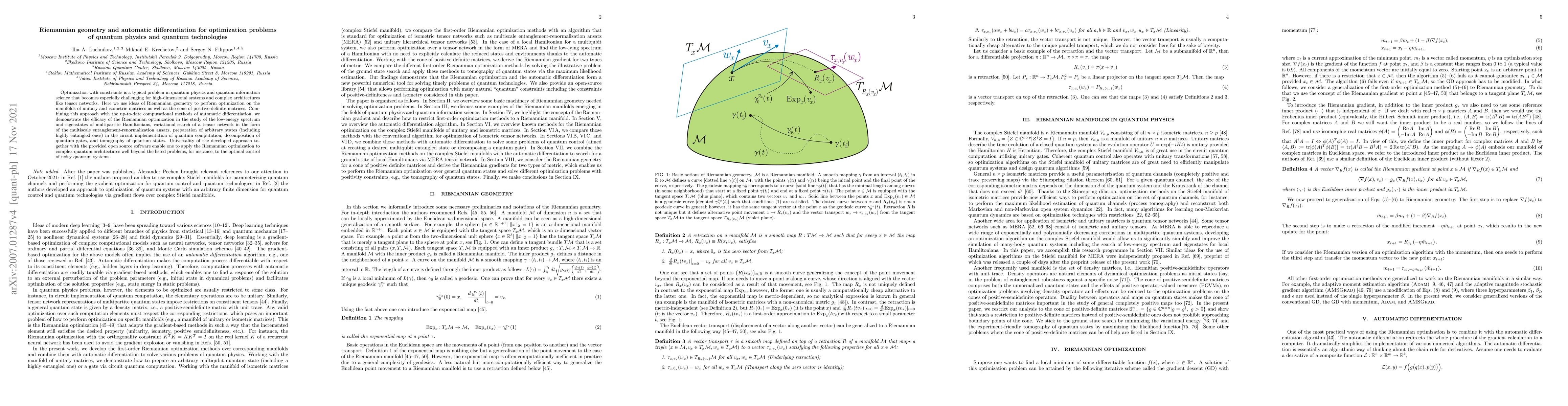 This paper employs Riemannian geometry and automatic differentiation to optimize constrained problems in quantum physics, demonstrating its effectiveness for tasks like low-energy spectrum analysis, variational search in tensor networks, and quantum state preparation. The developed approach is universal and supported by open-source software.