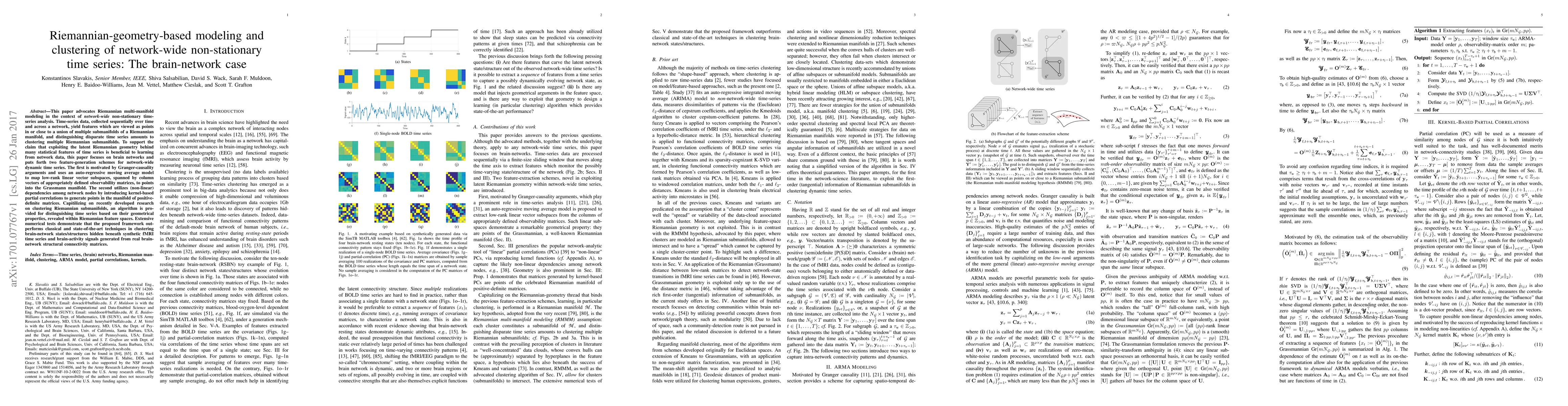 This paper advocates Riemannian multi-manifold modeling in the context of network-wide non-stationary time-series analysis. Time-series data, collected sequentially over time and across a network, yield features which are viewed as points in or close to a union of multiple submanifolds of a Riemannian manifold, and distinguishing disparate time series amounts to clustering multiple Riemannian submanifolds. To support the claim that exploiting the latent Riemannian geometry behind many statistical features of time series is beneficial to learning from network data, this paper focuses on brain networks and puts forth two feature-generation schemes for network-wide dynamic time series. The first is motivated by Granger-causality arguments and uses an auto-regressive moving average model to map low-rank linear vector subspaces, spanned by column vectors of appropriately defined observability matrices, to points into the Grassmann manifold. The second utilizes (non-linear) dependencies among network nodes by introducing kernel-based partial correlations to generate points in the manifold of positive-definite matrices. Capitilizing on recently developed research on clustering Riemannian submanifolds, an algorithm is provided for distinguishing time series based on their geometrical properties, revealed within Riemannian feature spaces. Extensive numerical tests demonstrate that the proposed framework outperforms classical and state-of-the-art techniques in clustering brain-network states/structures hidden beneath synthetic fMRI time series and brain-activity signals generated from real brain-network structural connectivity matrices.