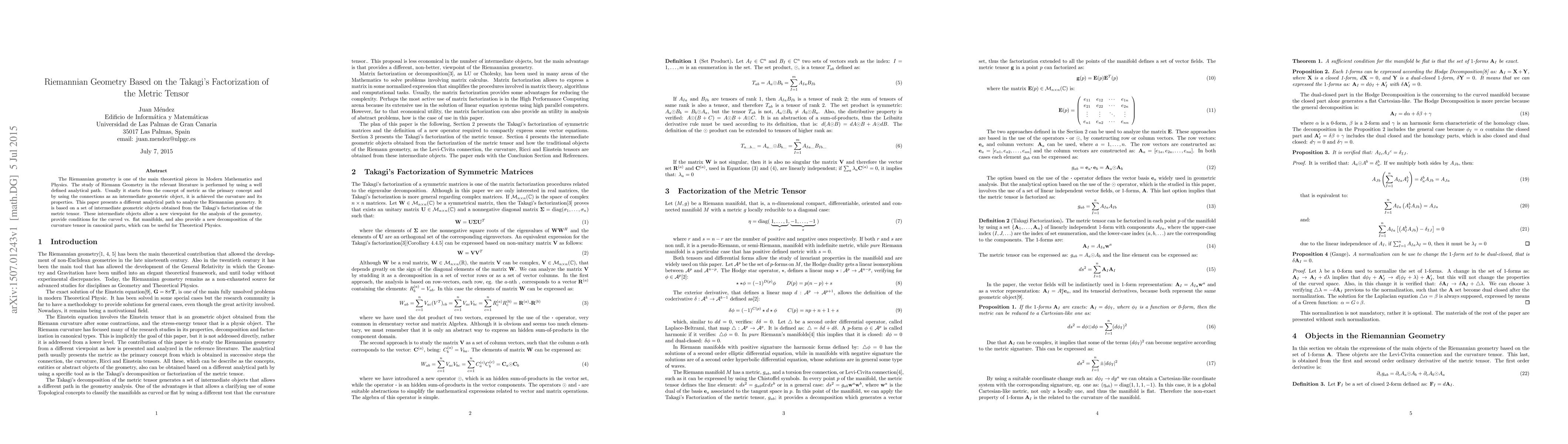 The Riemannian geometry is one of the main theoretical pieces in Modern Mathematics and Physics. The study of Riemann Geometry in the relevant literature is performed by using a well defined analytical path. Usually it starts from the concept of metric as the primary concept and by using the connections as an intermediate geometric object, it is achieved the curvature and its properties. This paper presents a different analytical path to analyze the Riemannian geometry. It is based on a set of intermediate geometric objects obtained from the Takagi's factorization of the metric tensor. These intermediate objects allow a new viewpoint for the analysis of the geometry, provide conditions for the curved vs. flat manifolds, and also provide a new decomposition of the curvature tensor in canonical parts, which can be useful for Theoretical Physics.