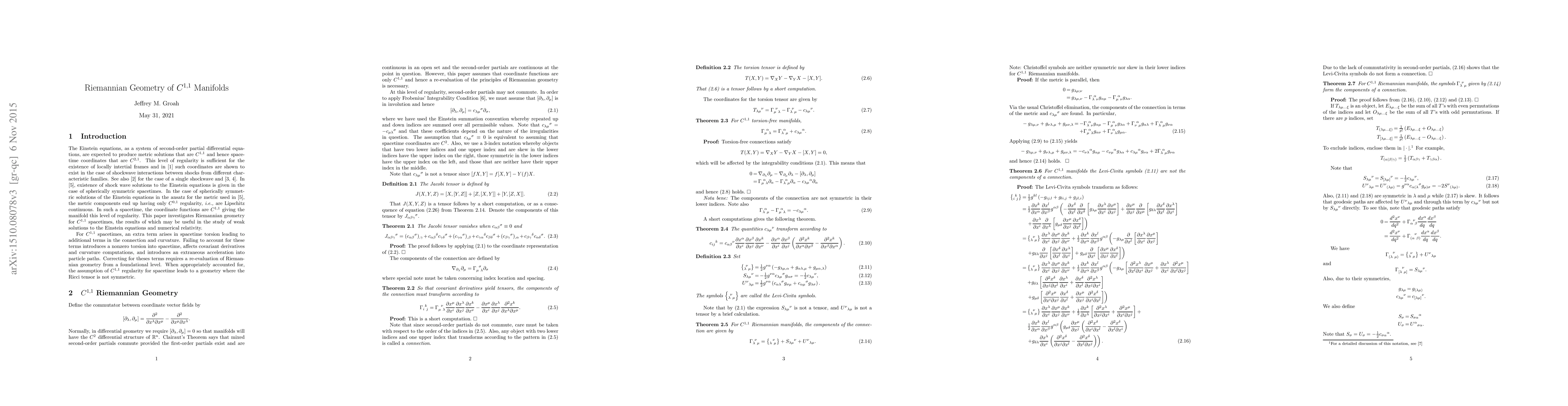 The paper develops Riemannian geometry for $C^{1,1}$ manifolds, showing that the connection is not symmetric and introducing additional terms in curvature tensors, geodesic equations, and Bianchi identities due to non-zero torsion.
