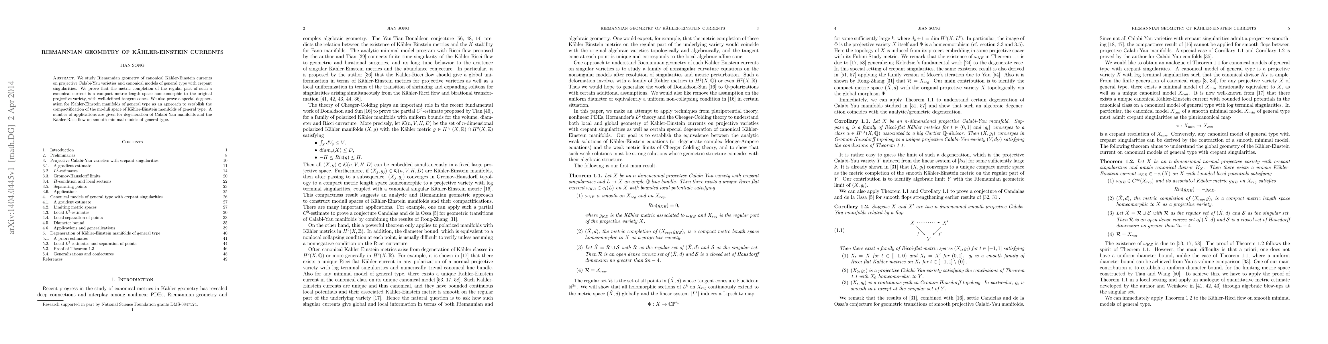 This research explores the Riemannian geometry of Kahler-Einstein currents on specific projective varieties. It proves the metric completion of these currents' regular parts forms compact spaces homeomorphic to the original variety, with defined tangent cones. The study also presents a special degeneration method for Kahler-Einstein manifolds of general type, aiming to compactify their moduli space, with applications in Calabi-Yau manifold degeneration and Kahler-Ricci flow on minimal models of general type.