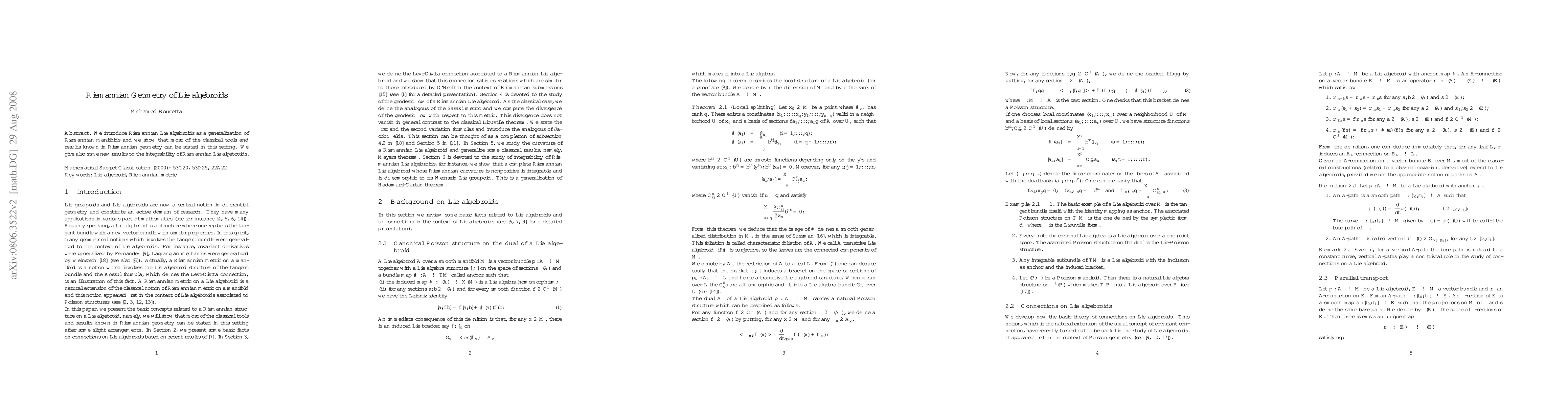 Summary: This paper generalizes Riemannian geometry to Lie algebroids, introducing Riemannian Lie algebroids and demonstrating that classical Riemannian geometry tools and results apply. It also presents new findings on the integrability of these structures.