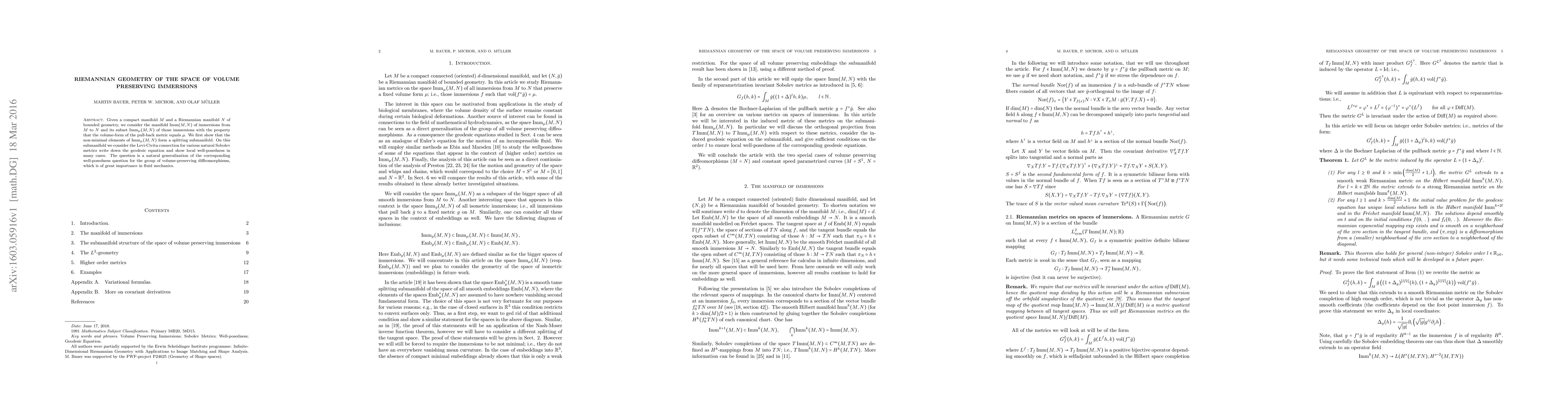 This paper investigates the geometry of volume-preserving immersions between compact manifolds and Riemannian manifolds, focusing on local well-posedness and geodesics, with implications for fluid mechanics.