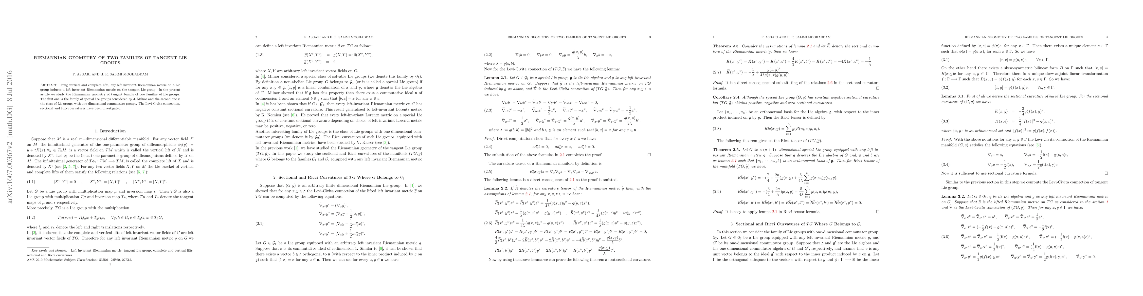 This paper explores the Riemannian geometry of tangent Lie groups derived from two families of Lie groups: special Lie groups by J. Milnor and those with one-dimensional commutator groups. It investigates the Levi-Civita connection, sectional, and Ricci curvatures induced by left invariant Riemannian metrics.